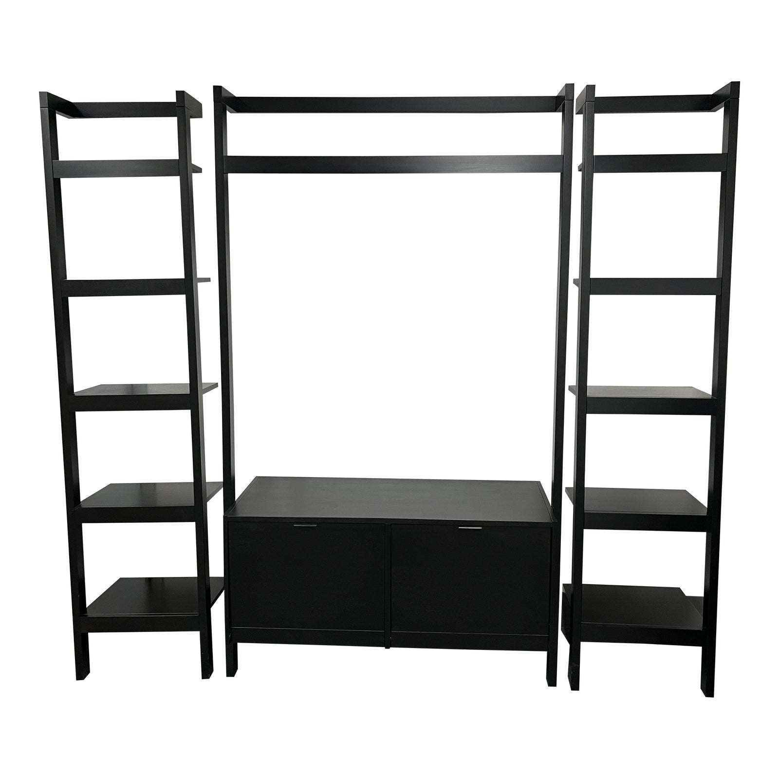 Design Plus Gallery presents a Crate & Barrel Sawyer Three Piece Leaning Shelves. Space efficient system creates plenty of storage + display opportunities while anchoring a large television setup. Solid wood is stained a graphic black punch. Collection is current and can be mixed with other options. There is minor wear through out, set is in good condition. Made in Thailand.