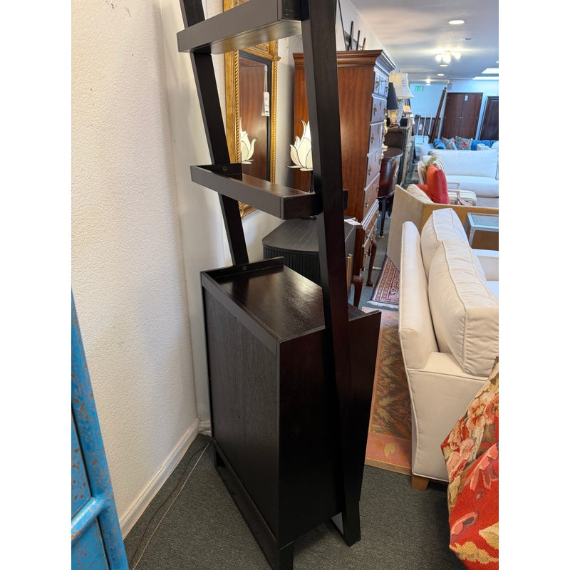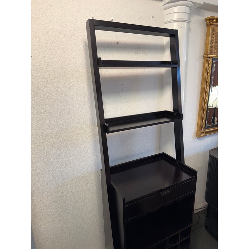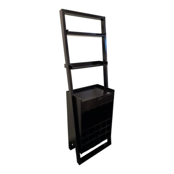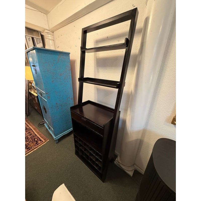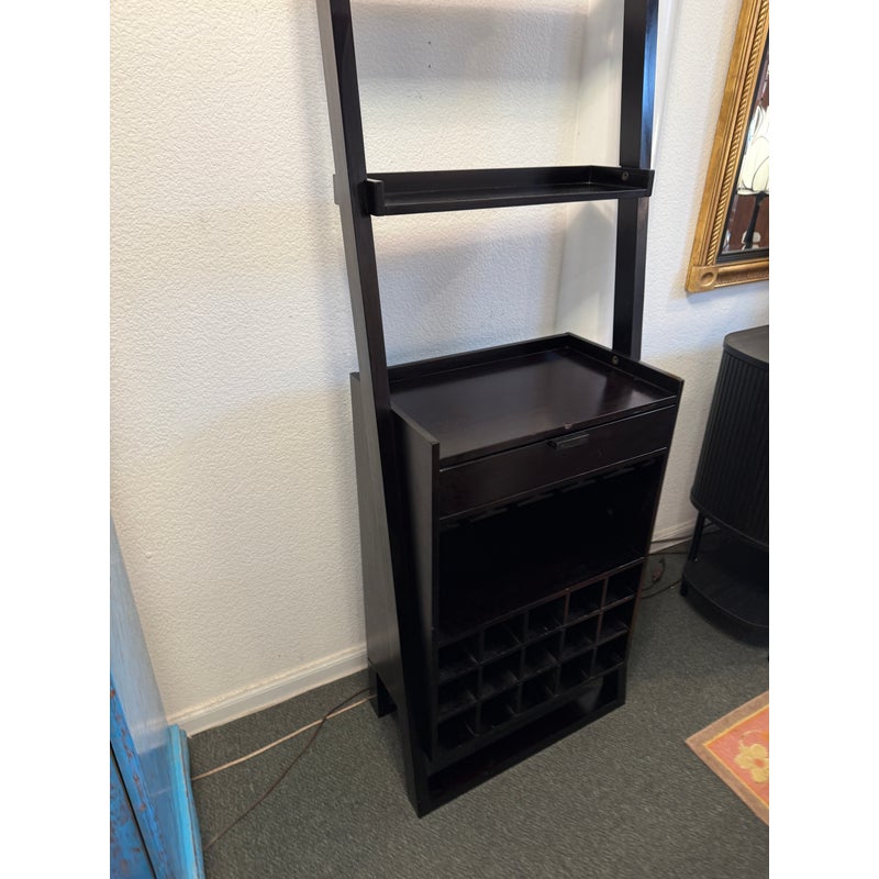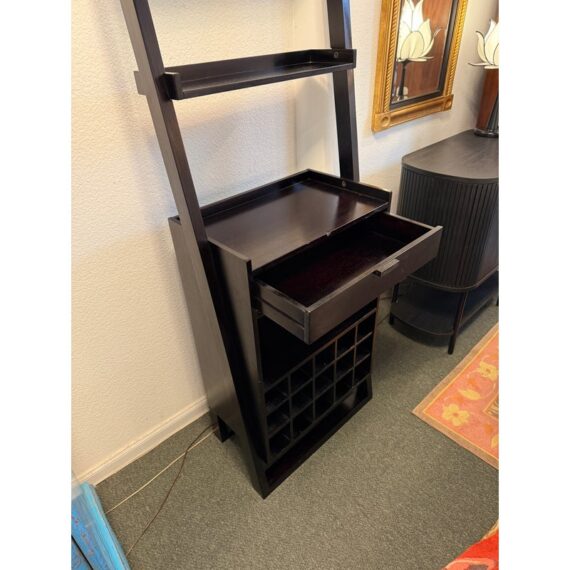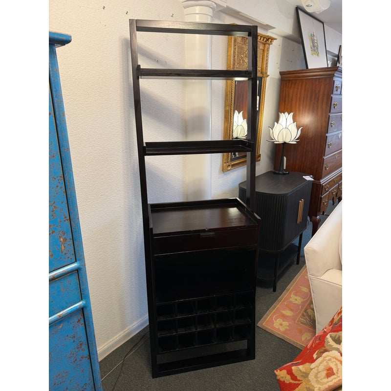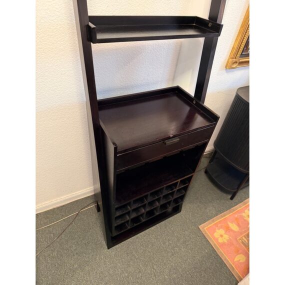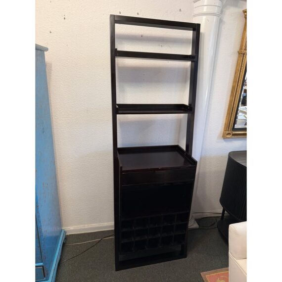 Design Plus Gallery presents the Sloane Wine Bar from Crate & Barrel. Modern, sleek and clean in expresso dark wood. Sturdy wine bar also has a storage drawer beneath the open serving area, and two fixed shelves above. Incredibly functional with space for glasses & bottles. Visible wear with scratches and nicks to the veneer.