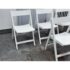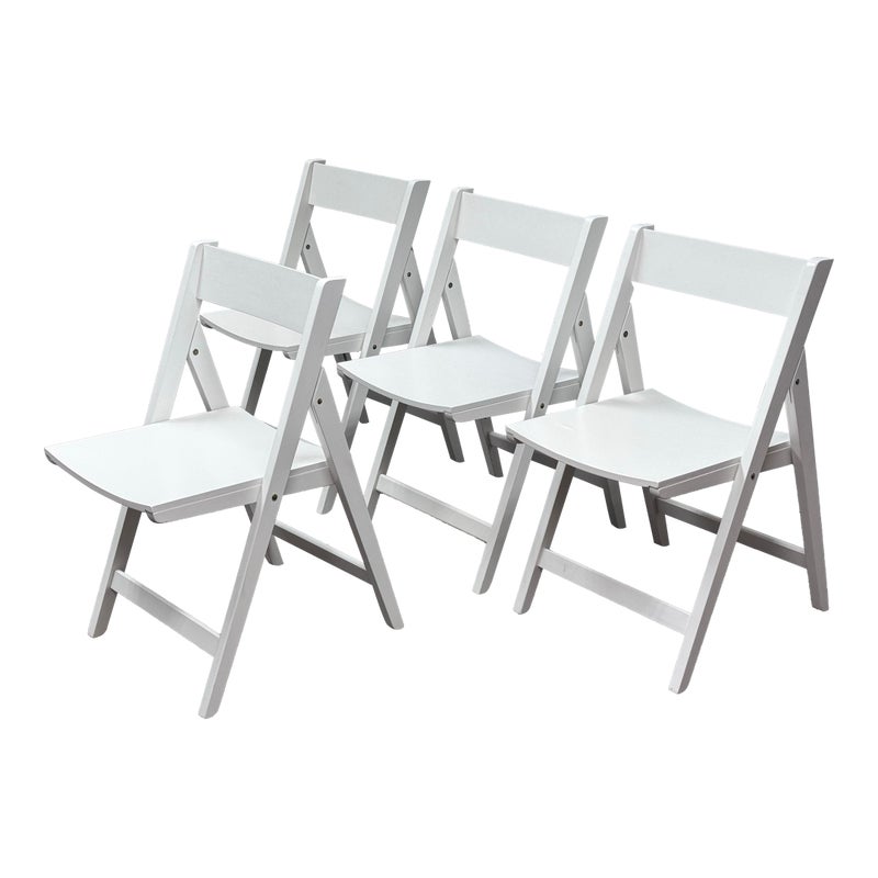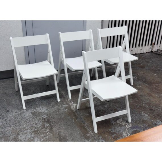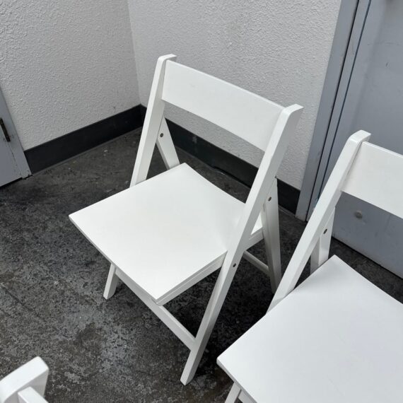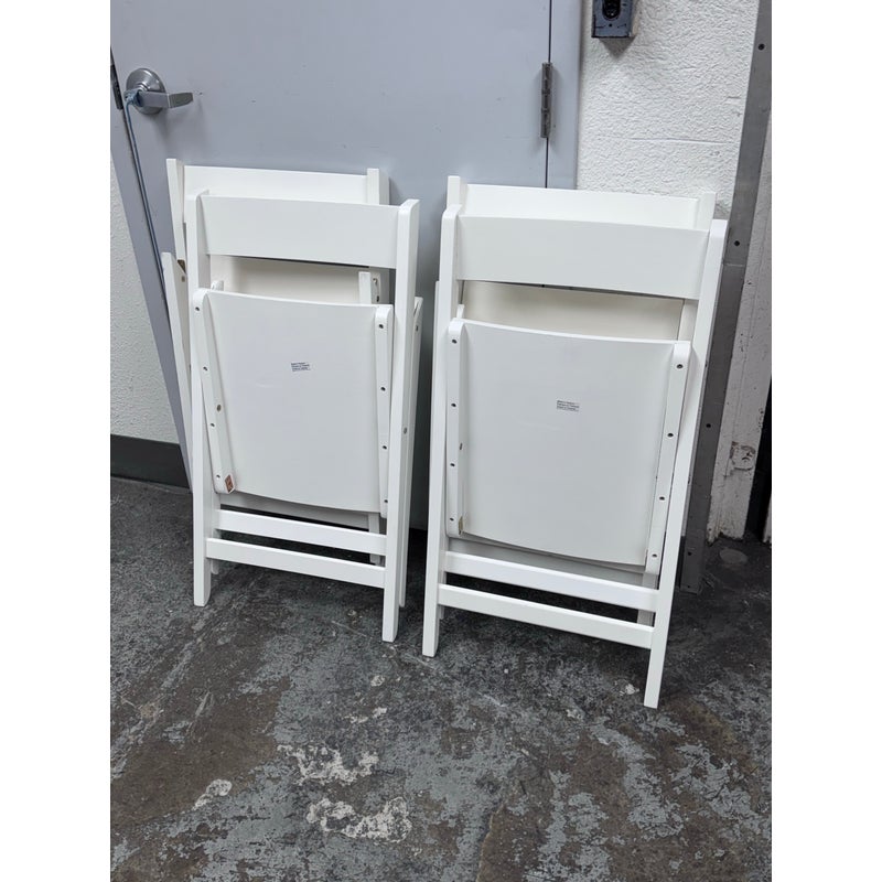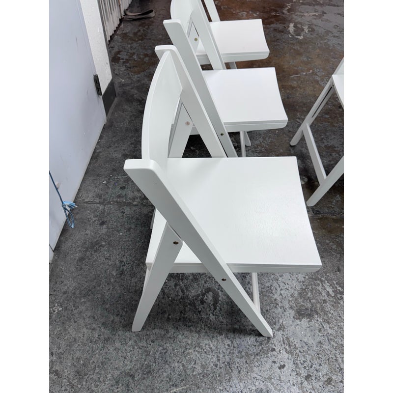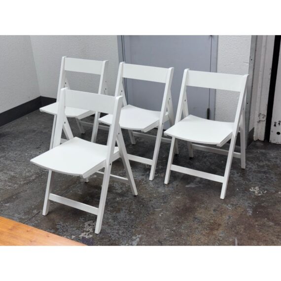 Design Plus Gallery presents a Set of Four Spare Folding Chairs from Crate & Barrel. The set of clean-lined white folding dining chairs give you a new modern silhouette with versatile functionality. Made from engineered wood with a crisp white stain for a match just about anything for any occasion. The chairs will fold easily for convenient storage while providing sturdy, comfortable seating for everyday dining or entertaining. In good condition, visible wear on veneer and minimal wear from usage.