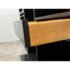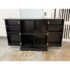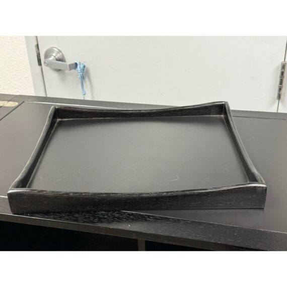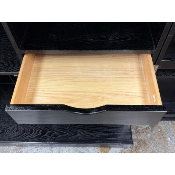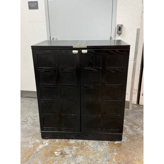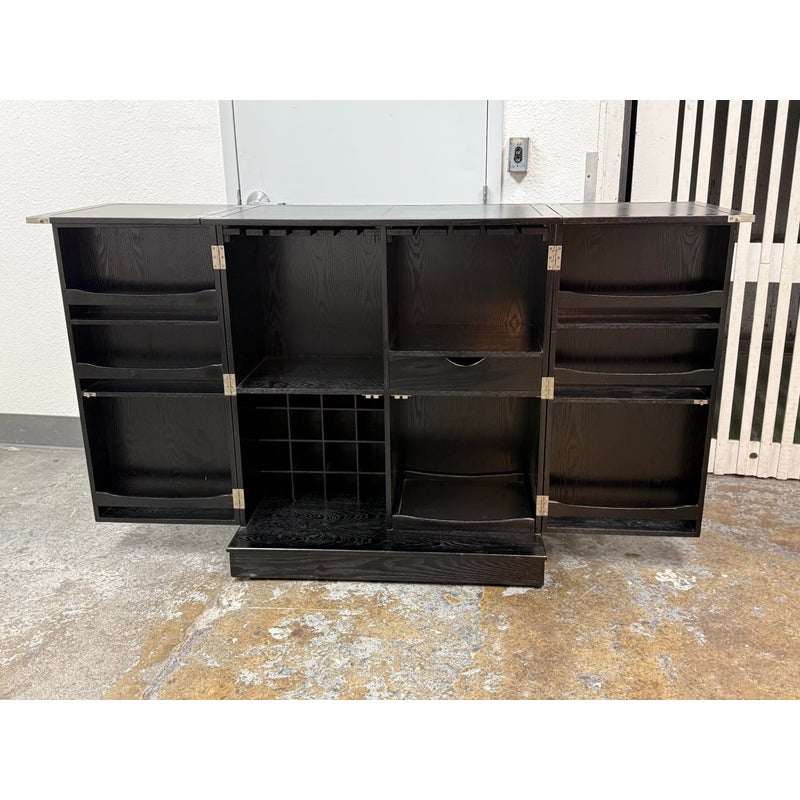 Design Plus Gallery presents a Steamer Bar by Crate & Barrel. In a black ash veneer with pronounced wood grain variation, this bar cabinet draws from vintage steamer trunks through paneled doors, metallic lip pulls, and a rectilinear plinth-base profile. The top opens outward to extend the surface and is lined for waterproof protection, while hidden casters are integrated below for easier movement. Inside, the cabinet offers an organized arrangement of shelves, cubbies, a drawer, and a removable tray for bottles, stemware, and bar accessories. This is a discontinued model with the brand and is in good condition with visible and minimal wear from usage. Made in the Philippines.