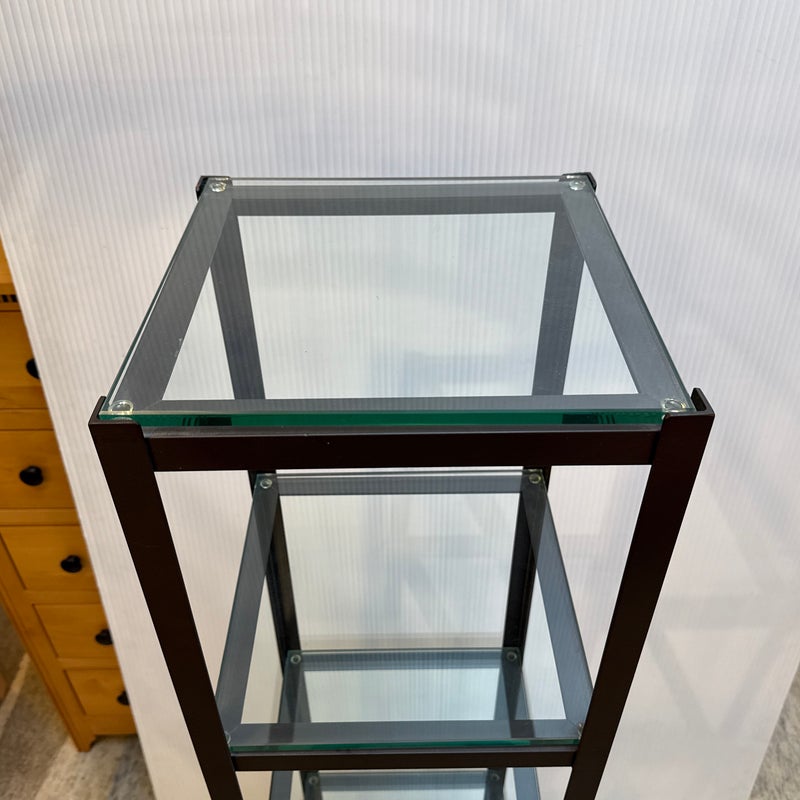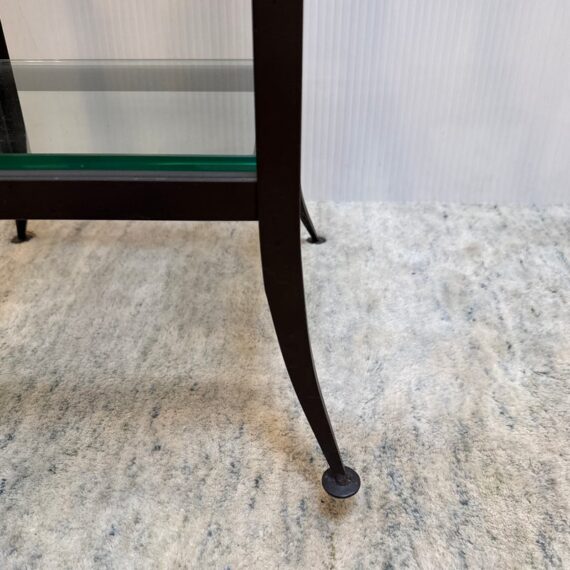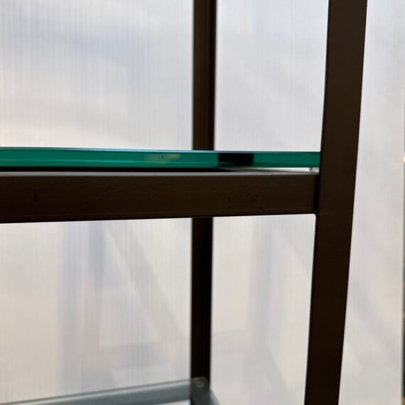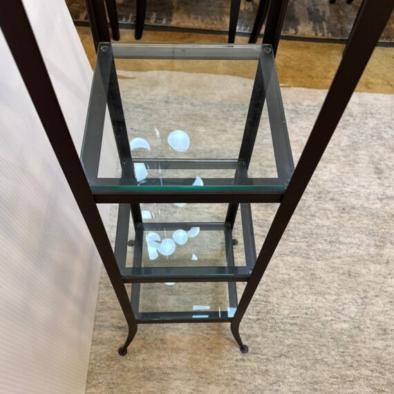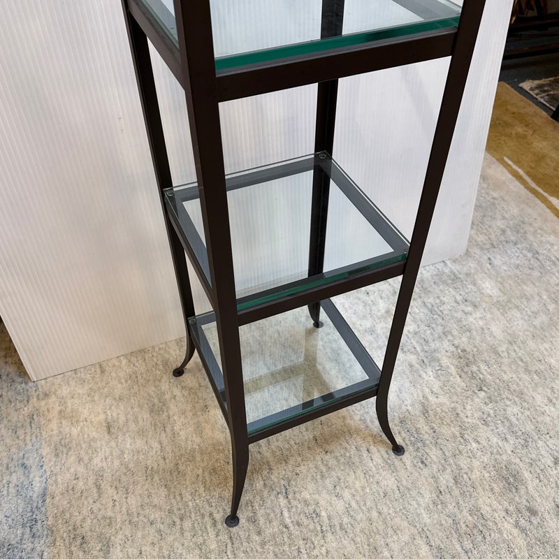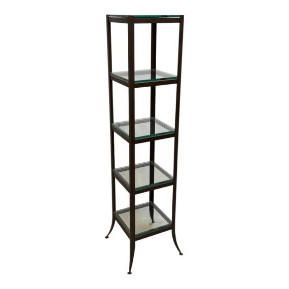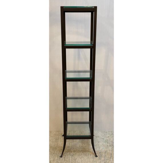 Design Plus Gallery presents a Steel & Glass Etagere from Crate & Barrel. The stacked shelving is the perfect blend of modern + industrial. It has an impactful aesthetic, a small footprint, and function. There are five glass slab shelves that are all equal in size, depth. The frame is finished in a bronze tone and is elevated on slightly splayed legs. Overall, the etagere is in good condition, visible and minimal wear consistent with age + use.