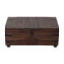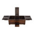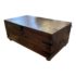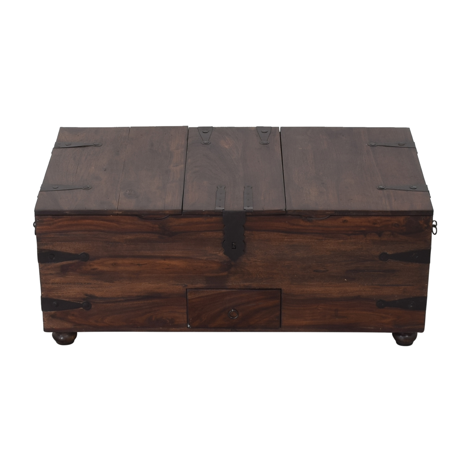 Design Plus Gallery presents a Taka Coffee Table by Crate & Barrel. The large rectangular storage pieces is constructed of solid wood with brown painted metal hinges and pulls, with removable bun feet. The interior has three sections for media and games, one has a removable divider for beverages and another has a smaller hidden compartment. Top doors open to expand playing, etc space. Durable and charming centerpiece for family or media room.