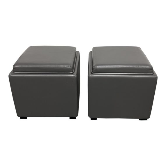 Design Plus Gallery presents a Pair of Stow Storage Ottomans by Crate & Barrel. Each 17 inch square is upholstered in leatherette in a smoke gray color. The legs and frame are constructed with hardwood for durability. The tray top has a plywood and veneer frame, and opens to reveal useful storage. Minor wear from use; ottomans are in good condition.