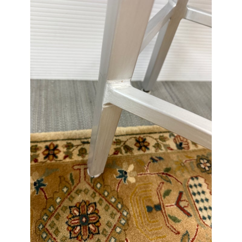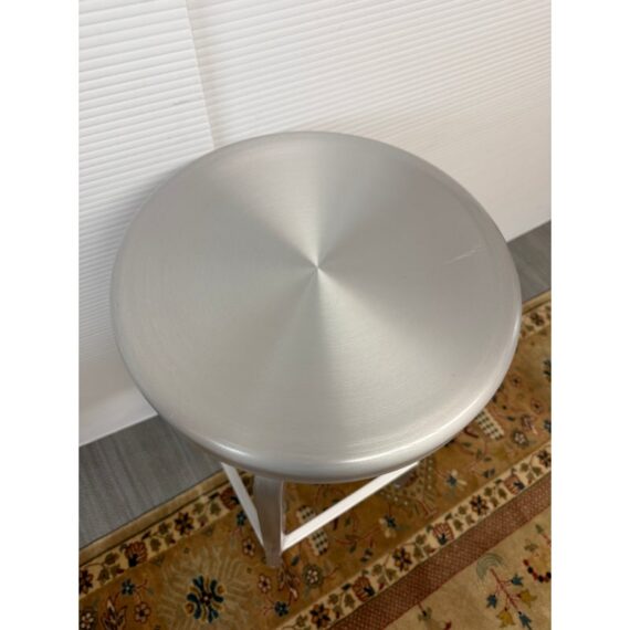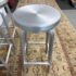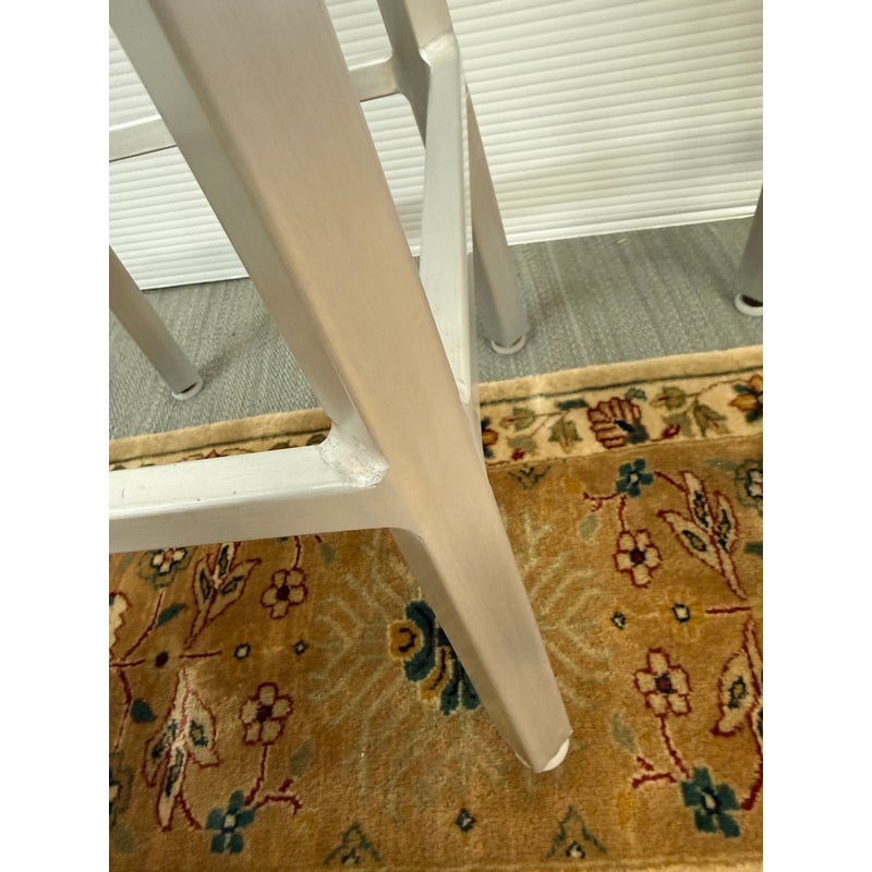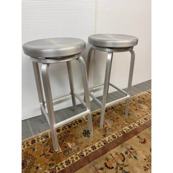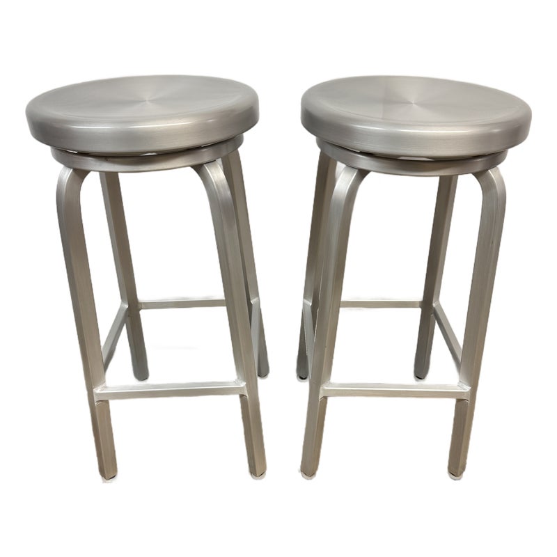 Design Plus Gallery presents a Pair of Swivel Bar Stools from Crate & Barrel. The stools are welded from aluminum and have a brushed finish. The round top seat swivels in all directions and make them an easy addition for inside or outside your home. Their style is no longer in production with the brand with the conditions being good, minor signs of wear from usage.