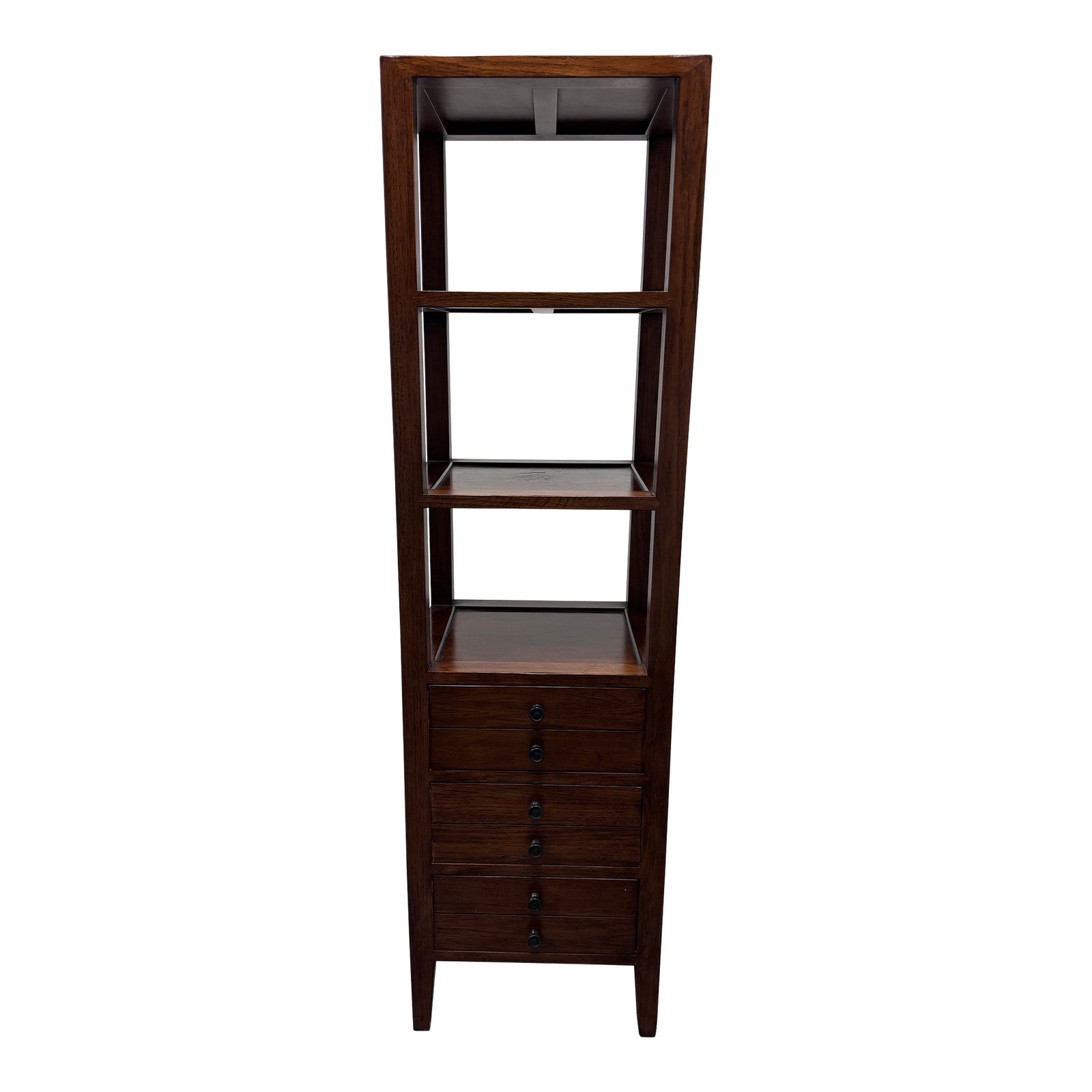 Design Plus Gallery presents a Tall Cabinets from Crate & Barrel. The cabinet has a medium honey brown finish and is of sturdy construction. The etagere has three shelves for display and three equal sized drawers for tucking items away to for organization. Is in good condition with dovetailed drawers and antique nickel hardware. Minimal surface wear.