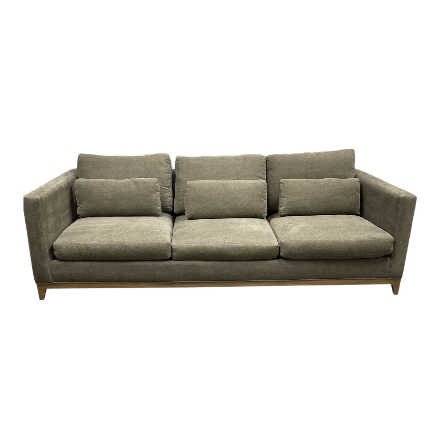 Design Plus Gallery presents a Taraval Sofa by Crate & Barrel. Casual, yet elegant, relaxes all conventions about what a living room sofa can be. Accompanied with three kidney cushions to hug your lower back in comfort. Exposed solid oak base takes on a relaxed attitude with a grey, weathered finish.The comfort experience is pure “gold standard,” with an eight-way hand-tied spring suspension system that supports your every move, and seat and back cushions wrapped in extra layers of luxurious down. Frame is benchmade with certified sustainable hardwood that’s kiln-dried to prevent warping Solid oak legs and base in a weathered grey finish. Eight-way, hand-tied spring suspension system. Soy-based polyfoam seat cushions with innerspring coil system, wrapped in polyfiber and feather-down. Visible and minor wear from usage. Made in North Carolina, USA.