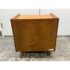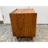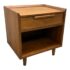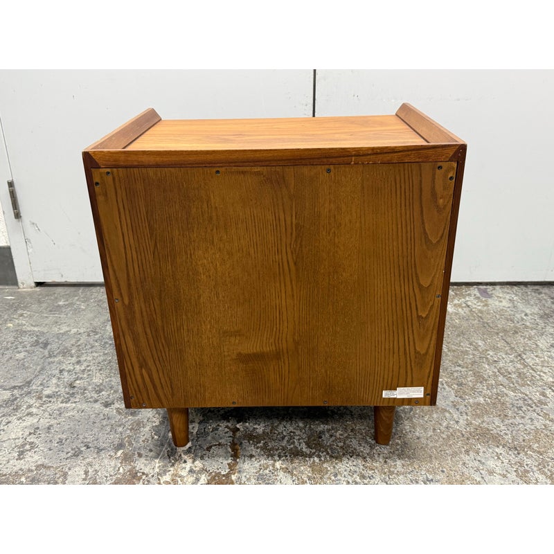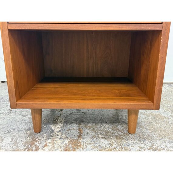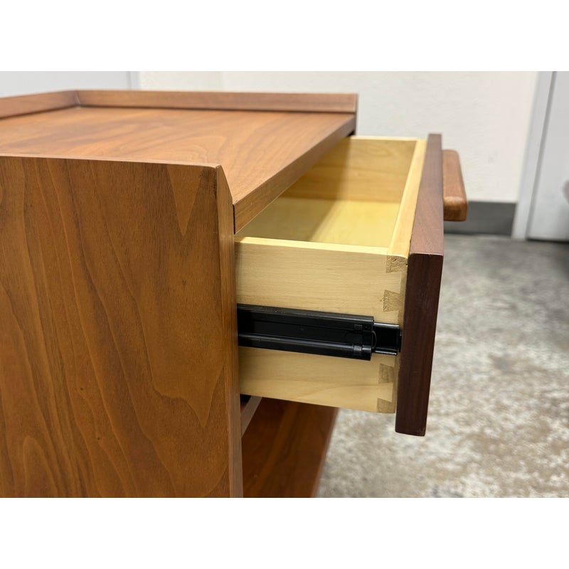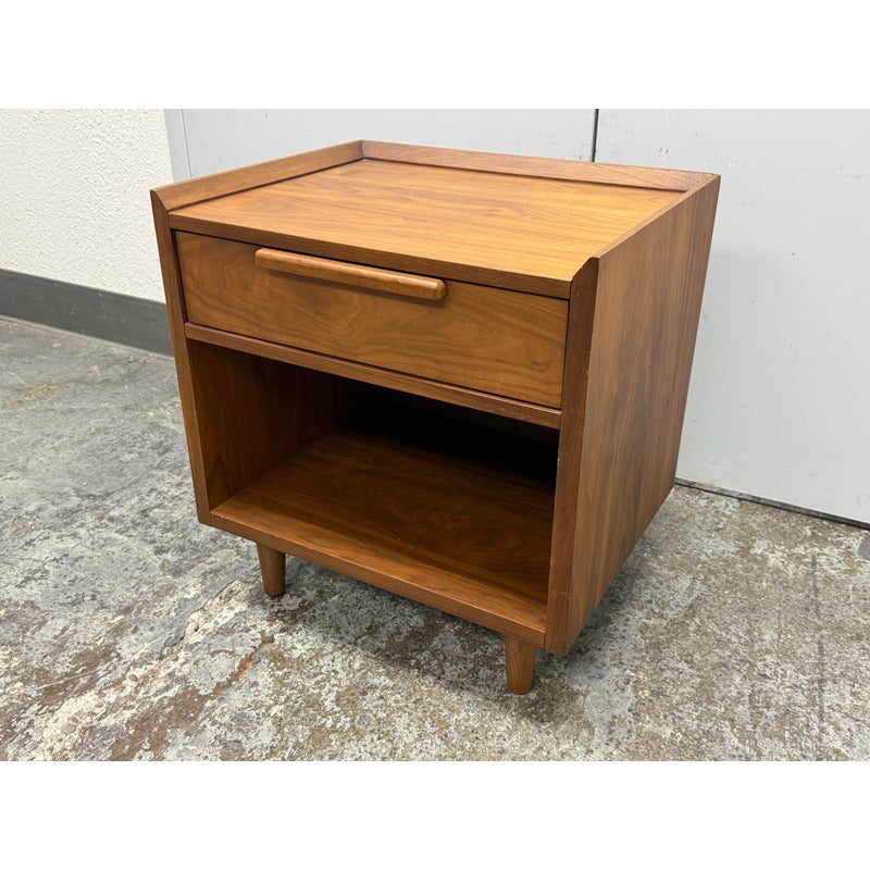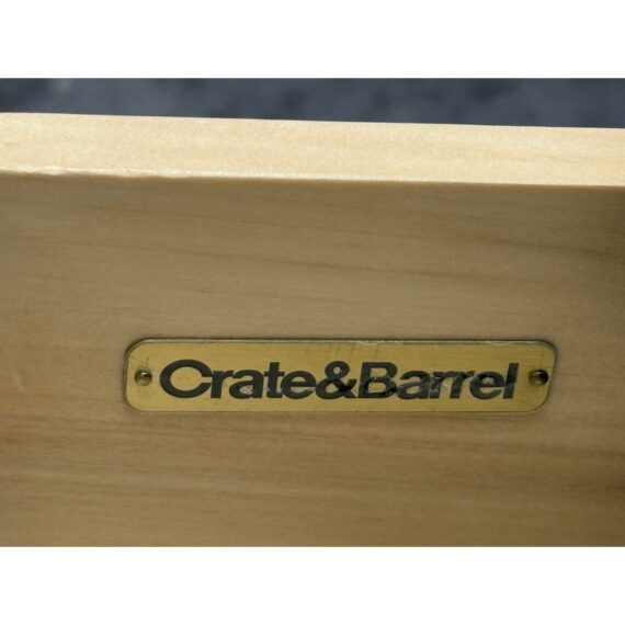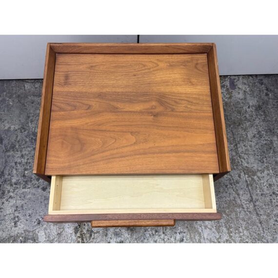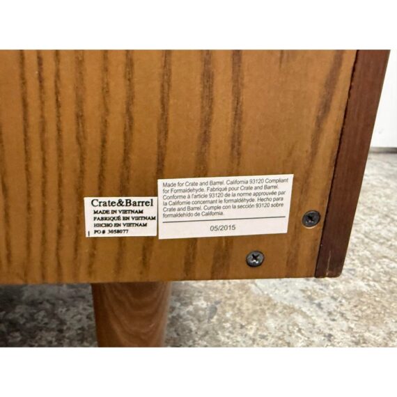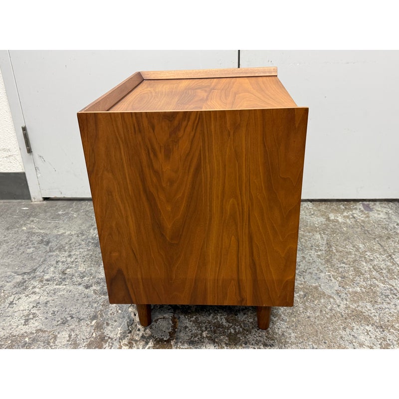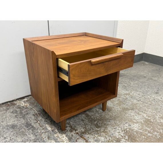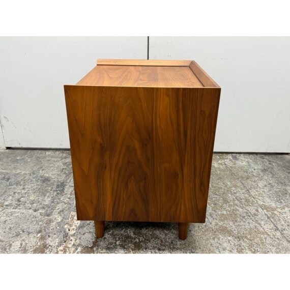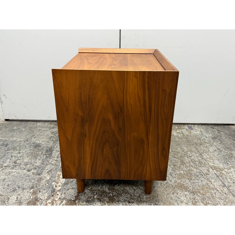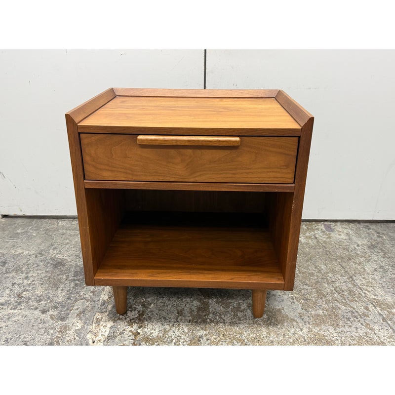 Design Plus Gallery presents the Tate Nightstand from Crate & Barrel. The 1960s-inspired Tate collection recalls the timelessness of mid-century design with tailored profiles and streamlined shapes. Made with the use of solid walnut and walnut veneer, Tate showcases gallery fronts and linear undercut drawer pulls supported by tapered turned legs. The nightstand’s single drawer and an open storage shelf provide roomy bedside storage. Is in good condition for its usage.