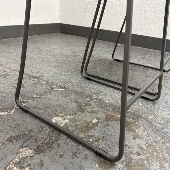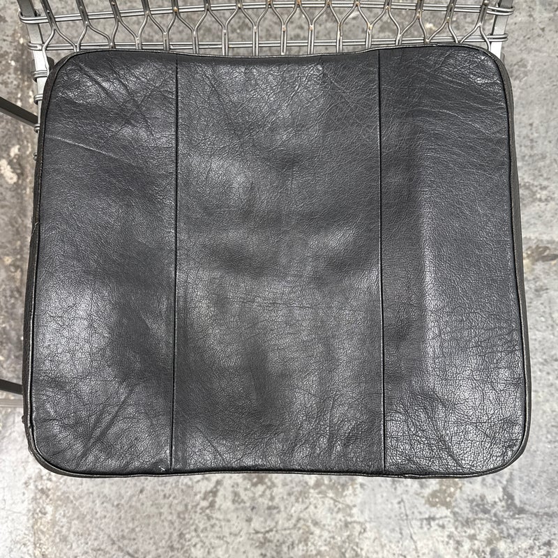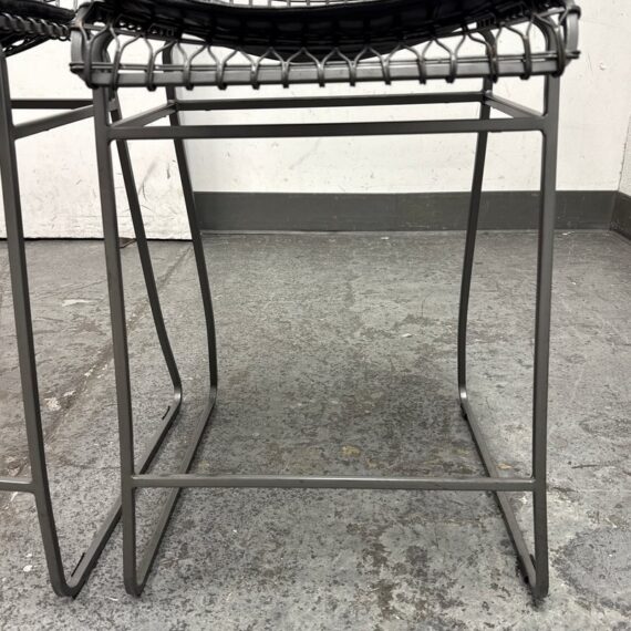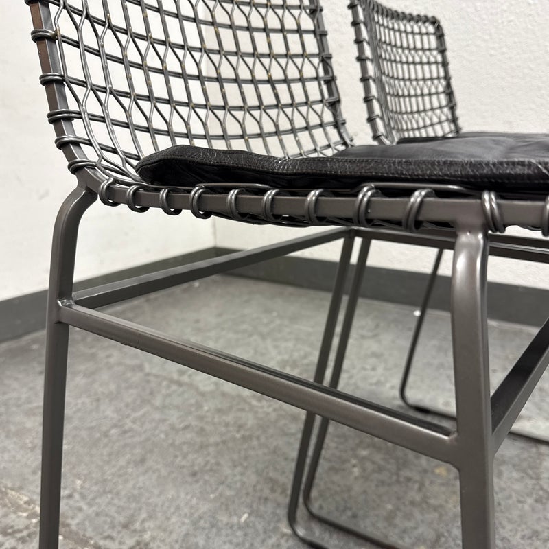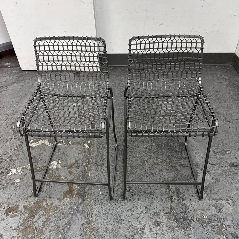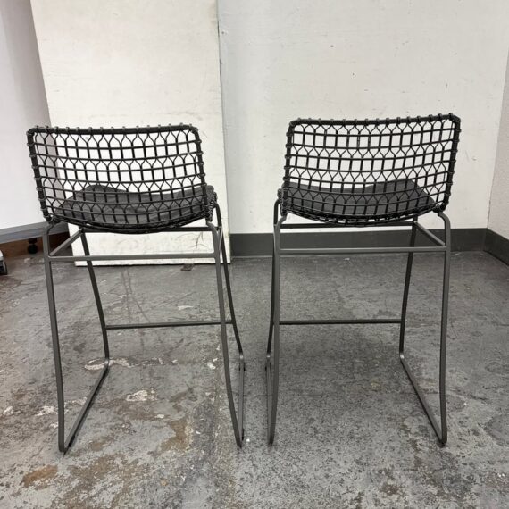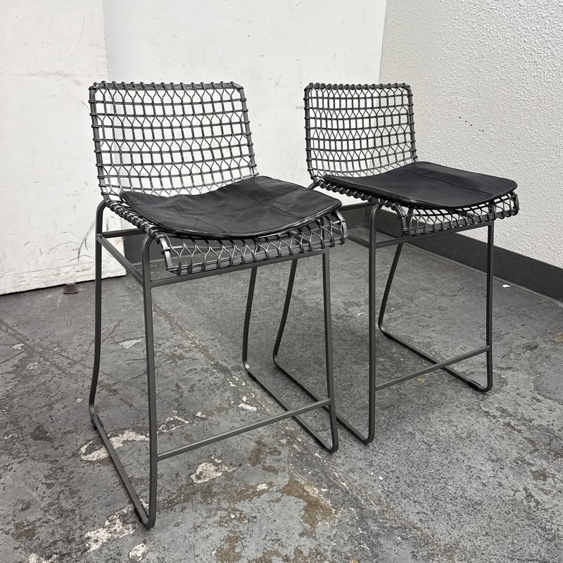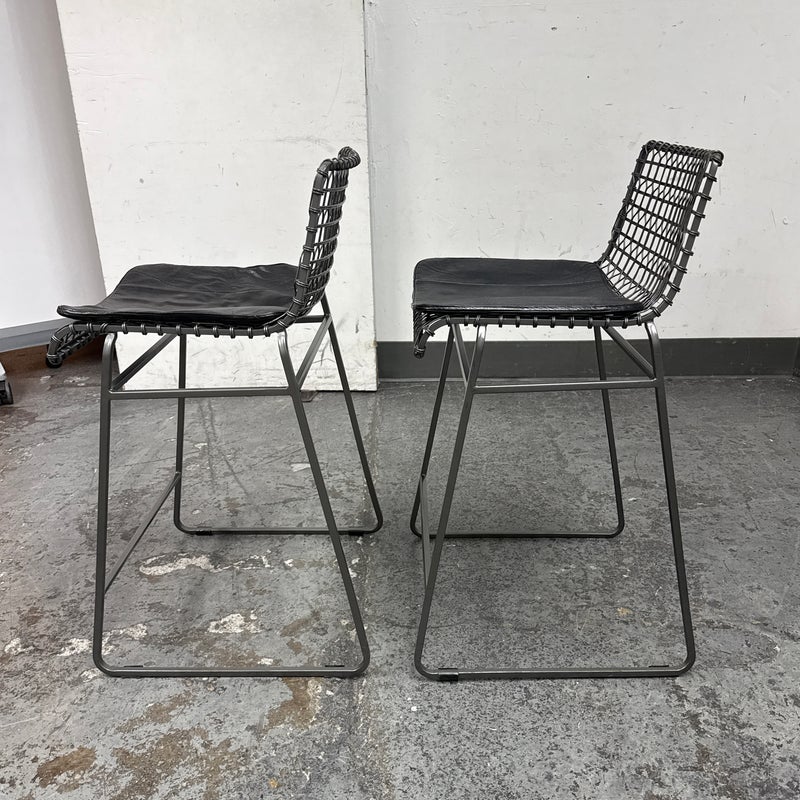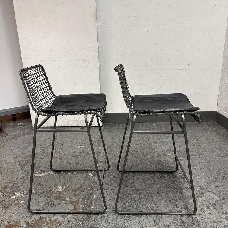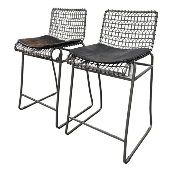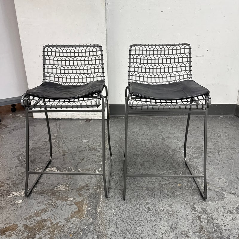 Design Plus Gallery presents a Pair of Tig Counter Stools from Crate & Barrel. Named for a complex welding technique used to secure non-ferrous metals and copper alloys, the Tig counter stools revel in the contrast of raw metals + the intricate welds that are typically covered with an opaque topcoat. Two leather tig specific cushions come with the stools. They are in good condition with minimal wear for their age + use. The style has been discontinued by the brand.