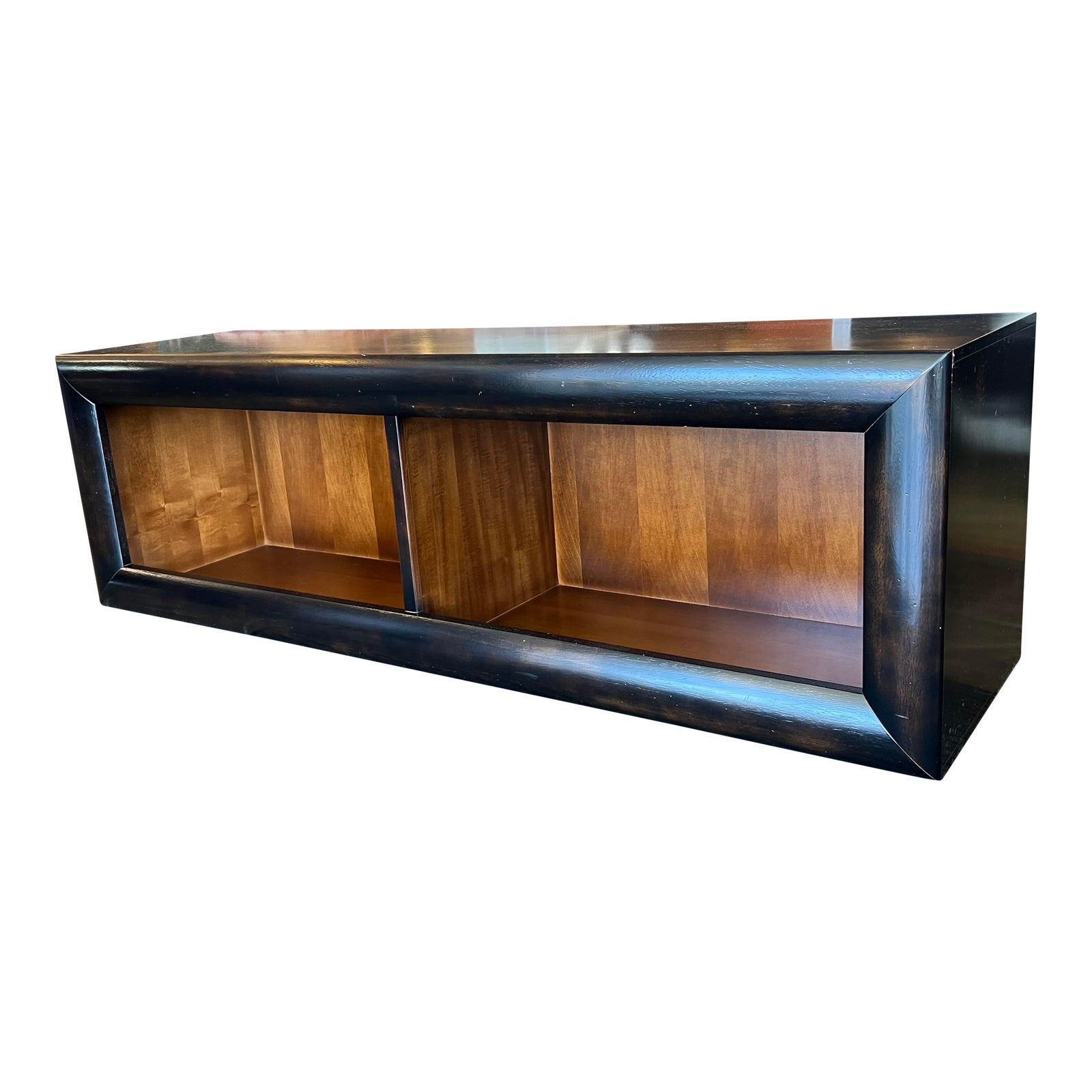 Design Plus Gallery presents a Transitional Media Cabinet by Buying & Design, IT for Crate & Barrel. The long Low has a rich brown rubbed finish, natural woodgrain interior.. The spacious unit has space for a large television. Clean lined, sophisticated storage. Light surface wear; condition is consistent with age and use. Made in Italy