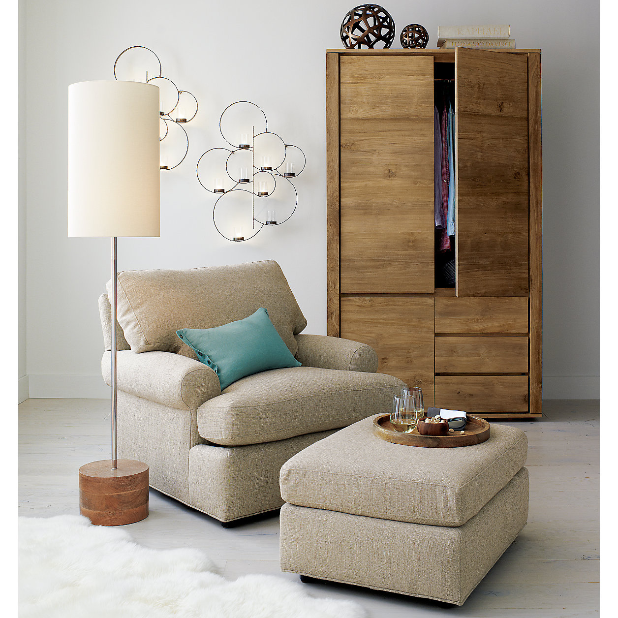 Design Plus Gallery presents a Tribeca Floor Lamp by Crate & Barrel. A contemporary floor lamp takes simplicity to a new level of sophistication with rounded forms separated by a super slender, polished pole. Perfectly balanced design features a smooth mango wood base with softly glowing clear finish and a tall cylinder shade in pure white cotton. Minor wear. Made in India.