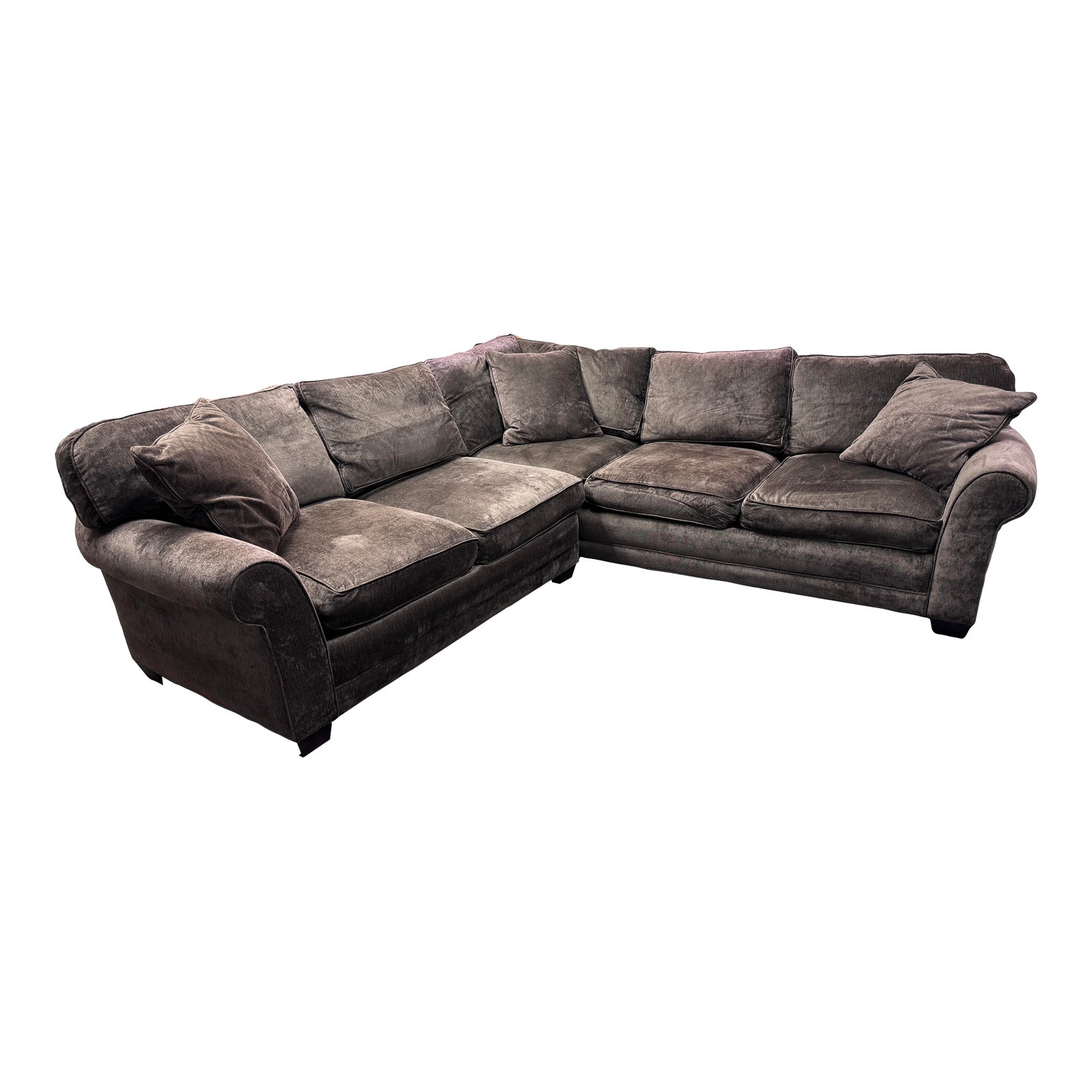Design Plus Gallery presents an L-Shaped Rolled Arm Sectional in a Brown Velour Fabric from Crate & Barrel. The sectional is in two pieces, with one side being longer that the other. There are five seat + six seat back cushions, and two loose ones altogether. There is some wear to the color of the sectional do to sun exposure = stains for usage.