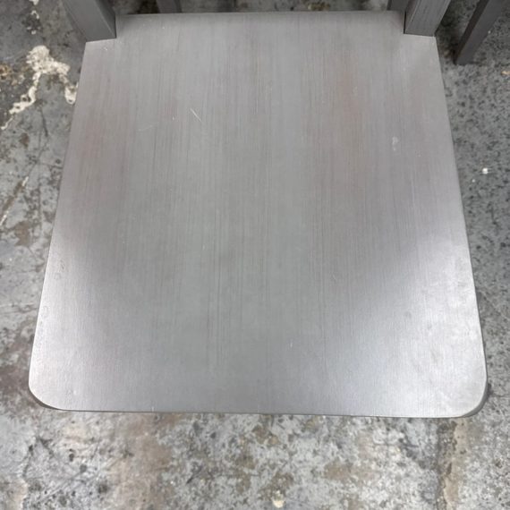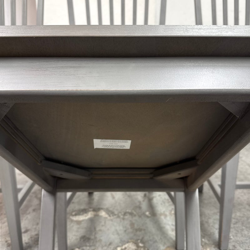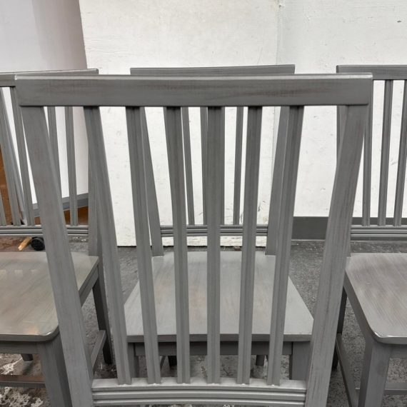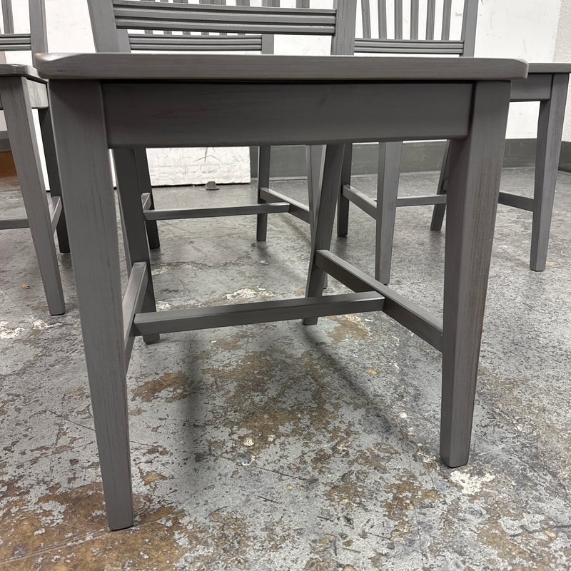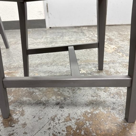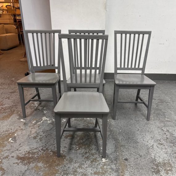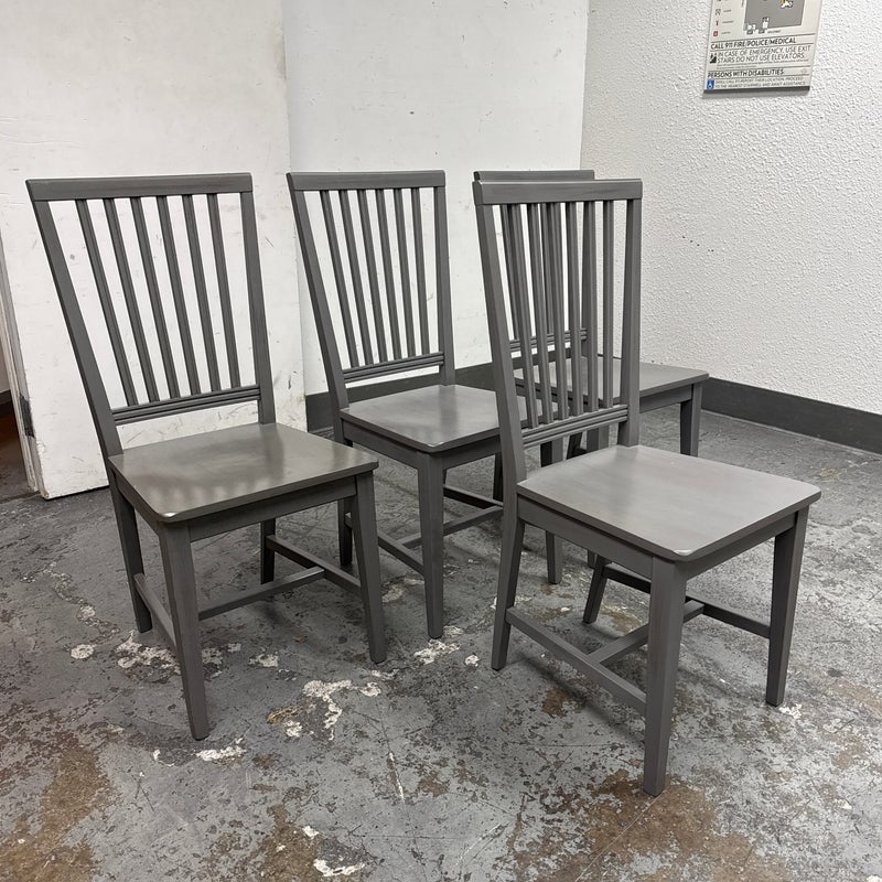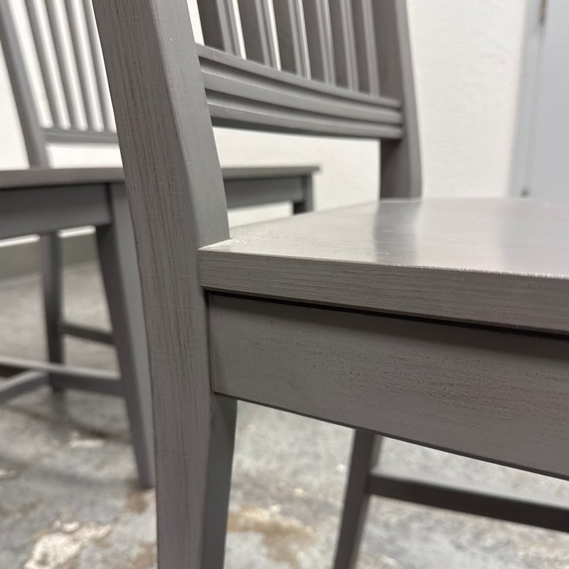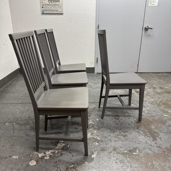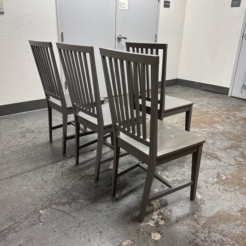 Design Plus Gallery presents a Set of Four Village Gray finish Dining Chairs by Crate & Barrel. A versatile dining chair set, the beechwood pulls up to the table with a generous molded seat and vertical slat back. Each chair is given a multi-step gray lacquer finish that’s hand applied. In good condition, visible and minimal wear from usage + age. This is a discontinued model. Made in Italy