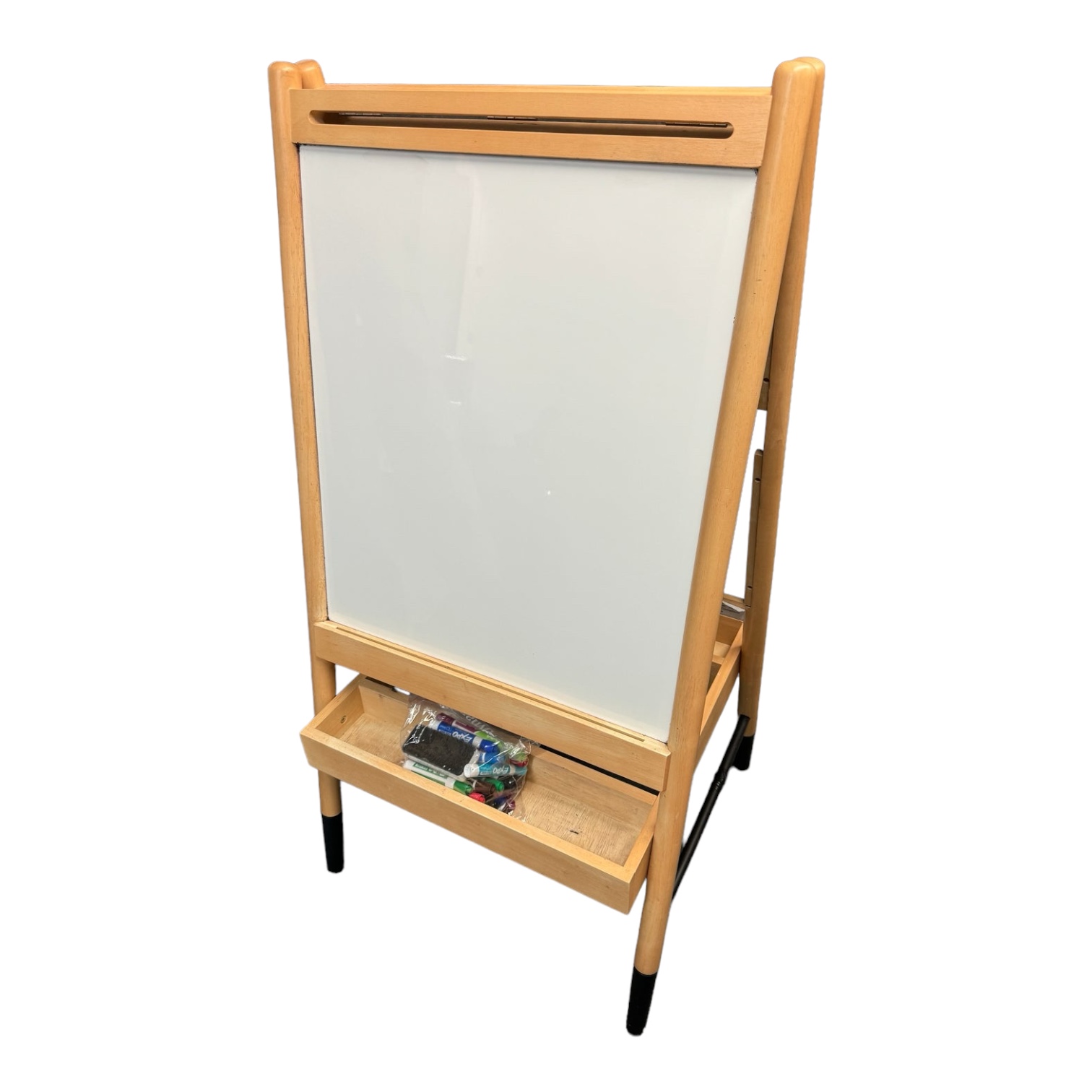 Design Plus Gallery presents a Kid’s Art Easel by Crate & Barrel. Perfect for your tiny artist, the Wooden Art Easel will inspire in three ways. One side of the easel is a chalkboard, the reverse is a whiteboard, and at the top a slot for a paper roll. Handy storage trays to hold all those arts and crafts supplies. Featuring sturdy natural rubberwood construction with skid-proof black-tipped feet. Light wear; small brace repair, condition consistent with age and use.