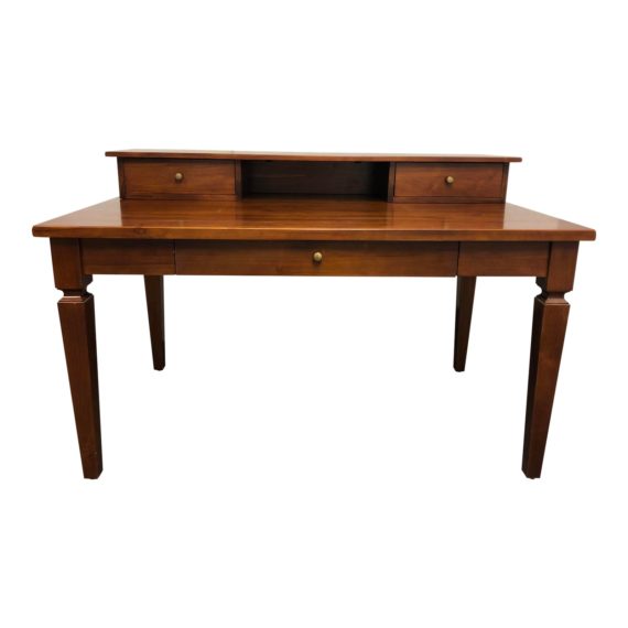 Design Plus Gallery presents a wood desk from Crate & Barrel in the transitional style with both modern adjustments and nods to the traditional. This modern update on the conservative office desk comes with a keyboard tray which folds down flat in front. Most of the wear is concentrated on the part that opens up where wrists or keyboards are placed. This piece also comes with a loose storage unit which could be used to elevate and position a computer monitor.