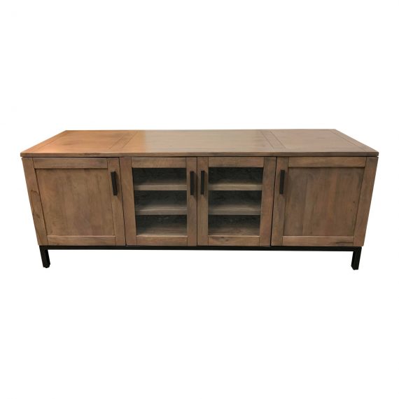 Design Plus Gallery presents the Wyatt Media Cabinet by Crate & Barrel. Clean lined gray-washed wood cabinet rests on an open, antiqued metal base with matching metal pulls. The contemporary media console has double remote-friendly glass-fronted doors; spacious adjustable shelves for electronic media, and cord access in rear.