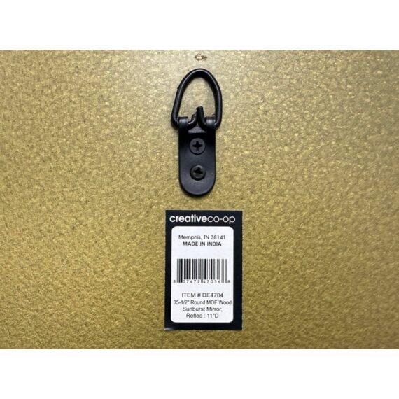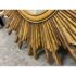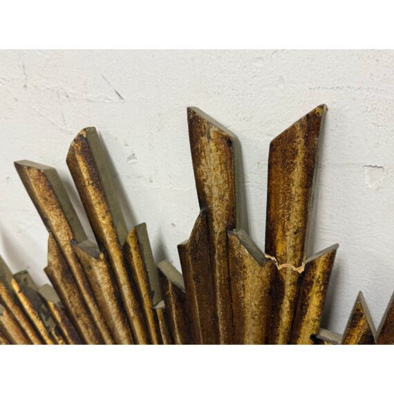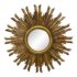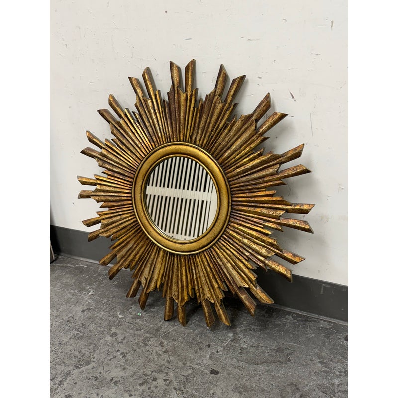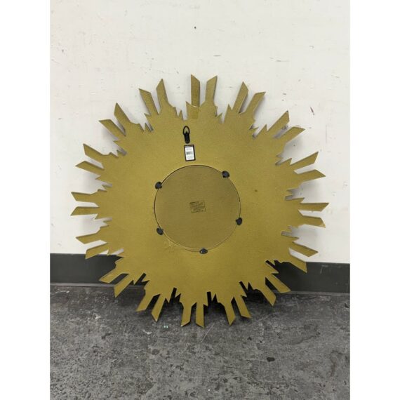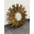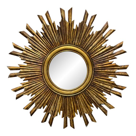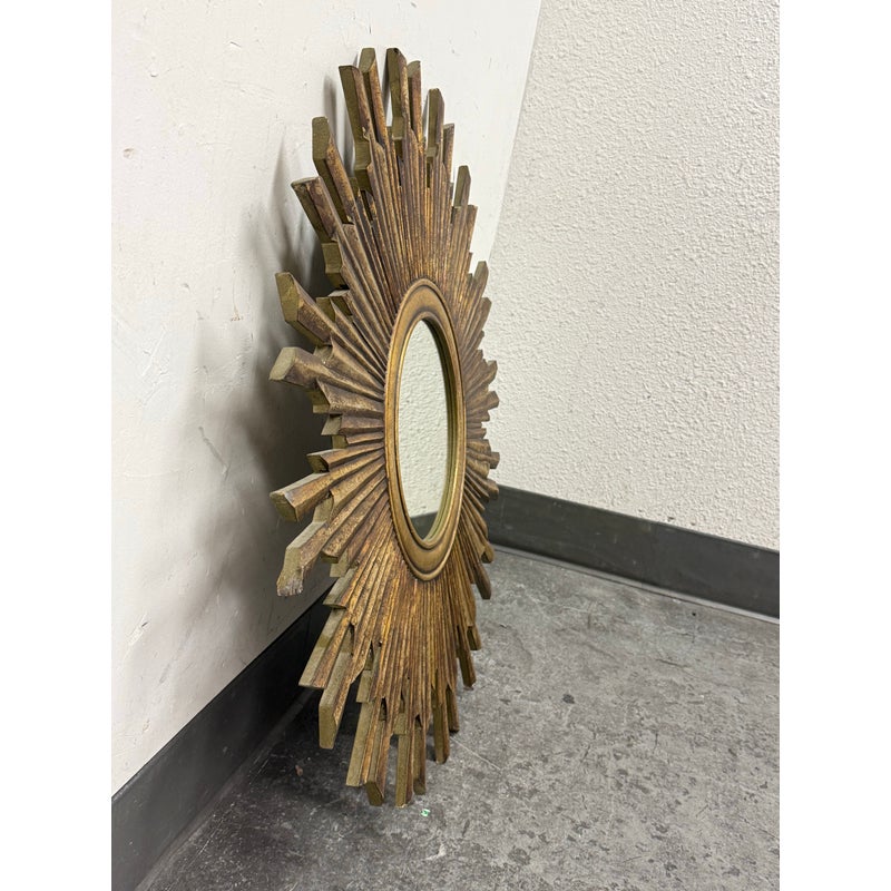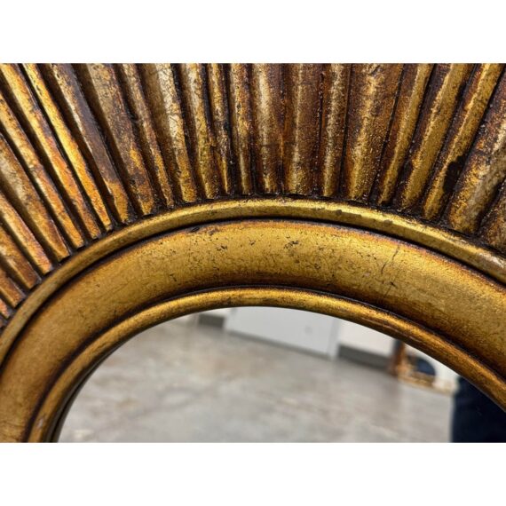 Design Plus Gallery presents a Wood Sunburst Mirror from Creative Co-Op. This round mirror has a layered radial frame in a gilt tone with carved rays and an intentionally aged surface that gives the piece depth and dimension. The center mirror is bordered by a molded circular surround, while the overall profile delivers a sculptural silhouette with strong texture and character. Manufacturer labeling is present to the reverse. It is in good condition with visible cracking and minimal wear from usage. Made in India.