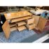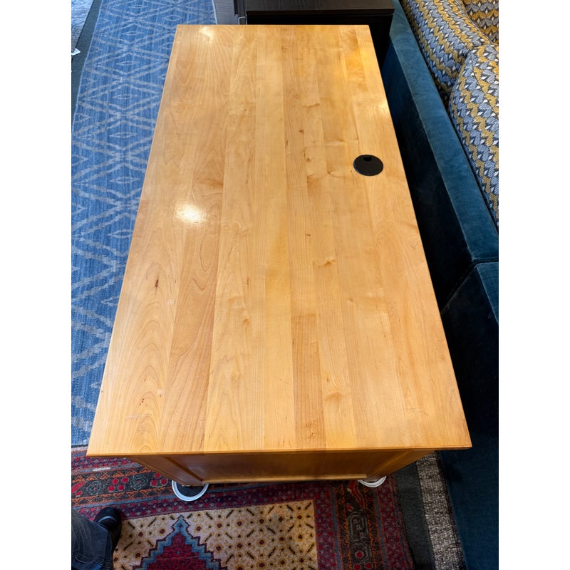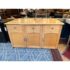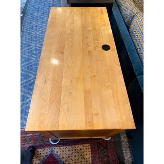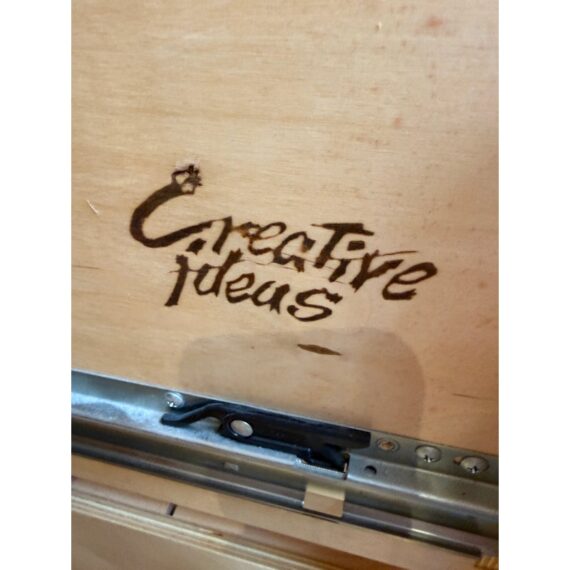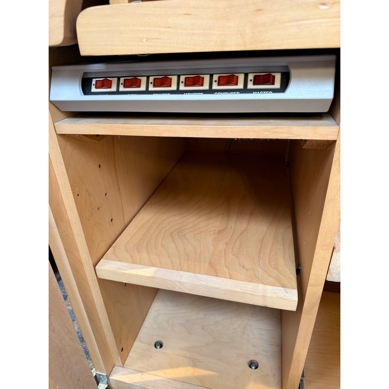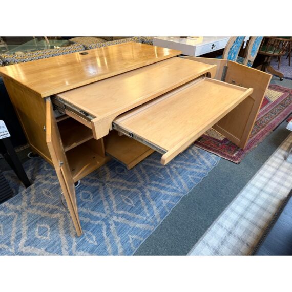Design Plus Galley presents an All in One Compact Desk from Creative Ideas. This desk is deceiving, in the best way. It has the look of a console that opens up and expands into a fully operating office. There are two doors with the right one folding in on itself and they open to reveal two desk tops that slide out, a circuit breaker for cord control, modular shelving insets, two deep drawers, and two center shelves that mimic the table tops and also slide out. Visible wear is present to the piece and its condition is fair for its usage.