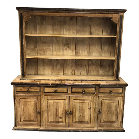 Design Plus Gallery presents a Vintage Credenza with Hutch. This beauty comes in two pieces. The base has four raised panel doors that when open reveal an open cupboard with one shelf that runs the width of the cabinet. It also has four raised panel drawers which maintain their original hardware. The Hutch portion has three display surfaces as well as a simple crown. The finish is very Rustic and gives the pieces loads of character.