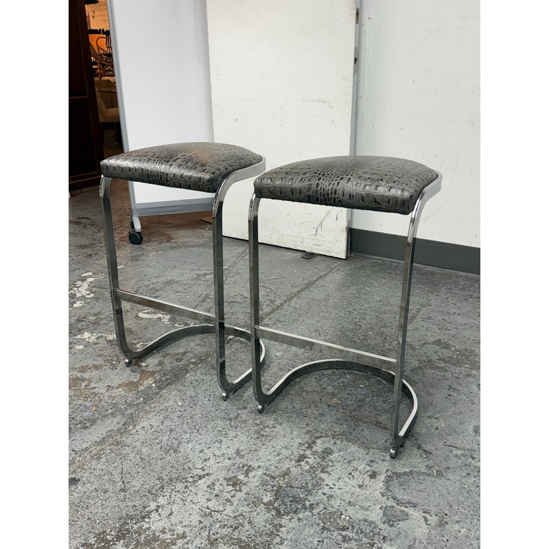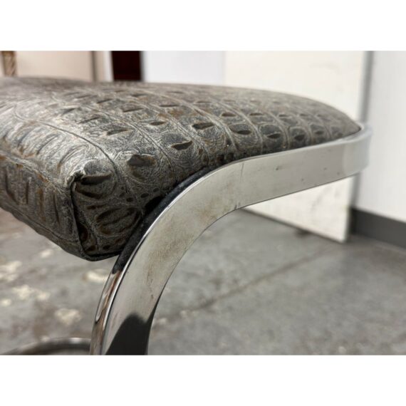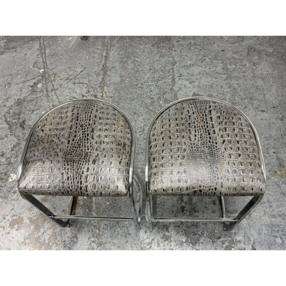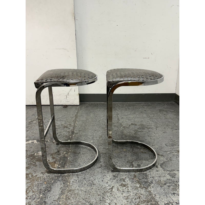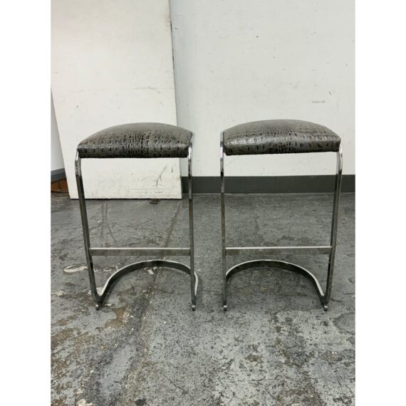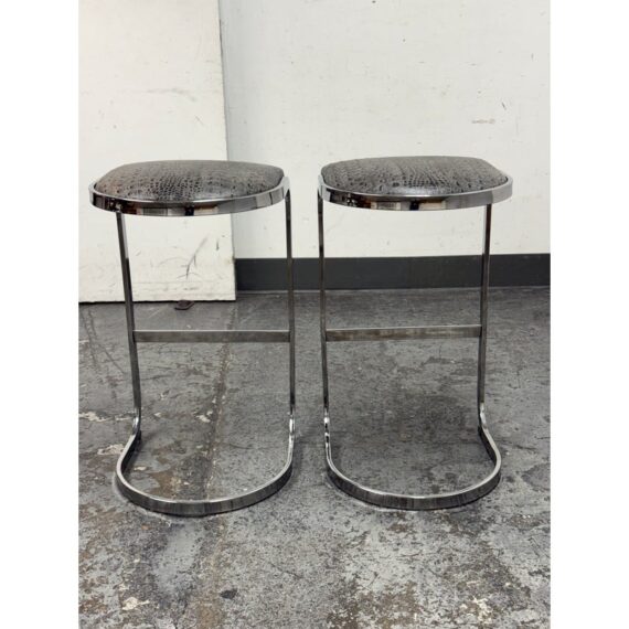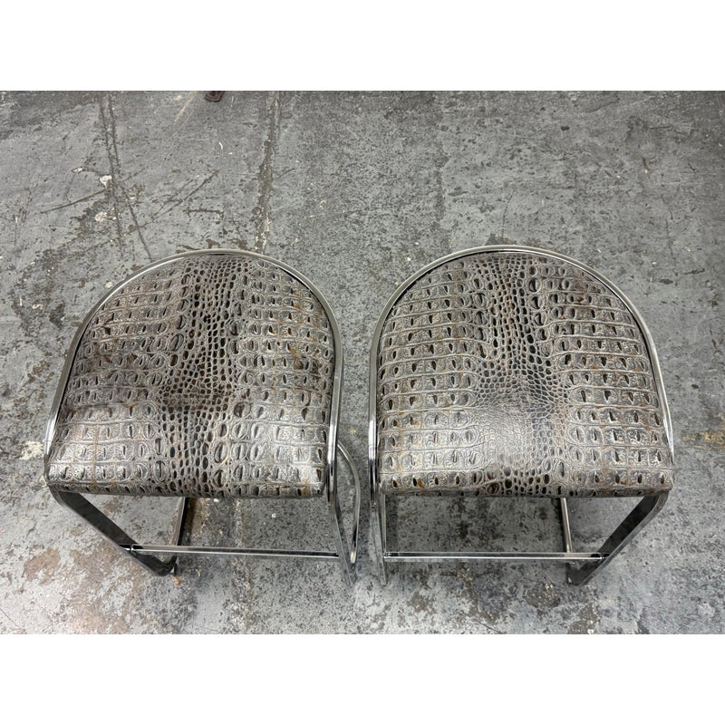 Design Plus Gallery presents a Pair of Cantilever Bar Stools with Crocodile Embossed Seats. The stools have a sturdy chrome tone frame with a stretcher for durability and a nice place to rest your feet on. The padded seat is in black with a crocodile print making them a great industrial touch to modern profile. In good condition, visible wear that is consistent with their vintage age.