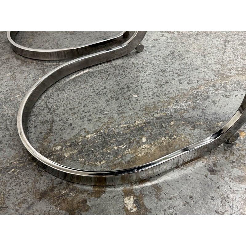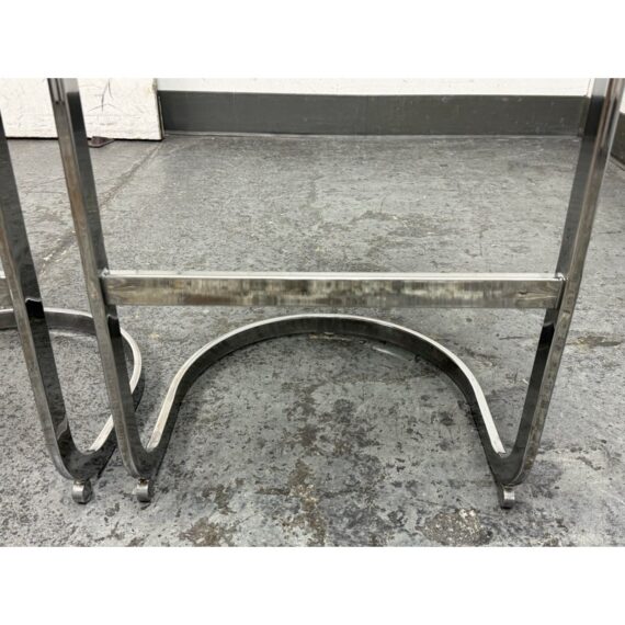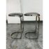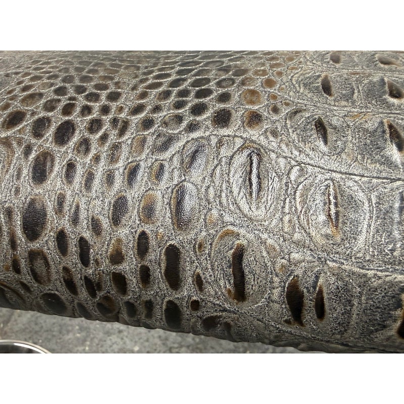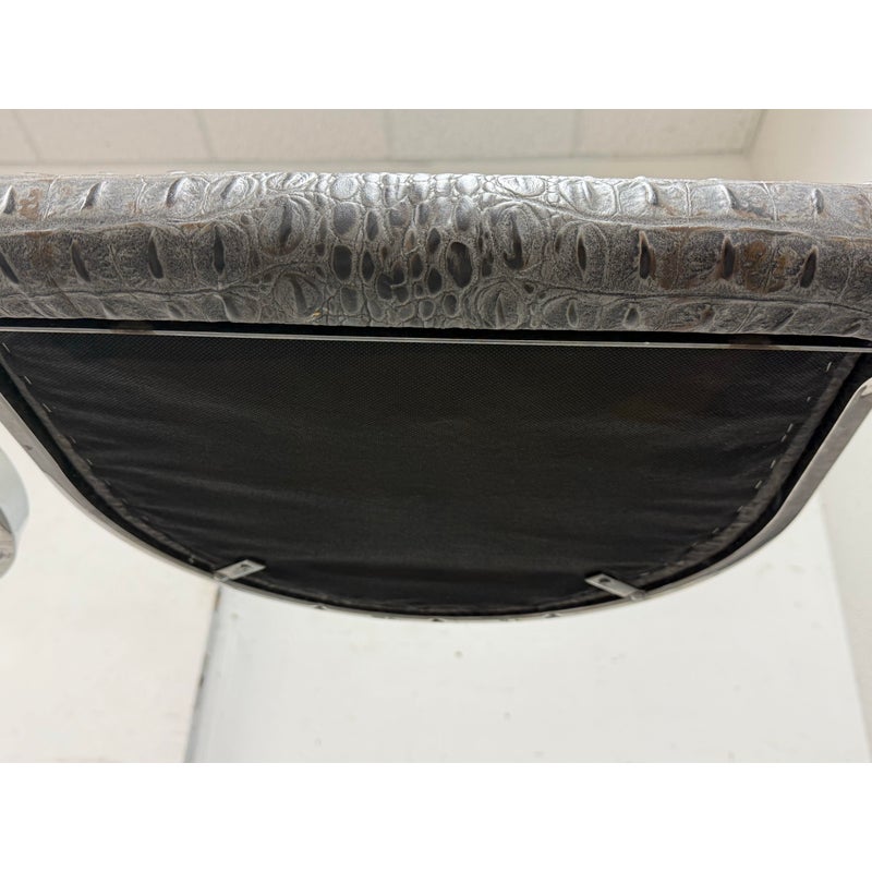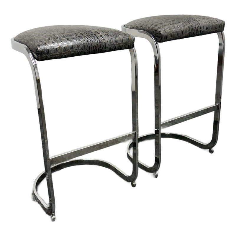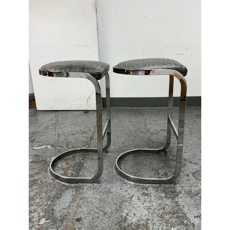 Design Plus Gallery presents a Pair of Cantilever Bar Stools with Crocodile Embossed Seats. The stools have a sturdy chrome tone frame with a stretcher for durability and a nice place to rest your feet on. The padded seat is in black with a crocodile print making them a great industrial touch to modern profile. In good condition, visible wear that is consistent with their vintage age.