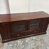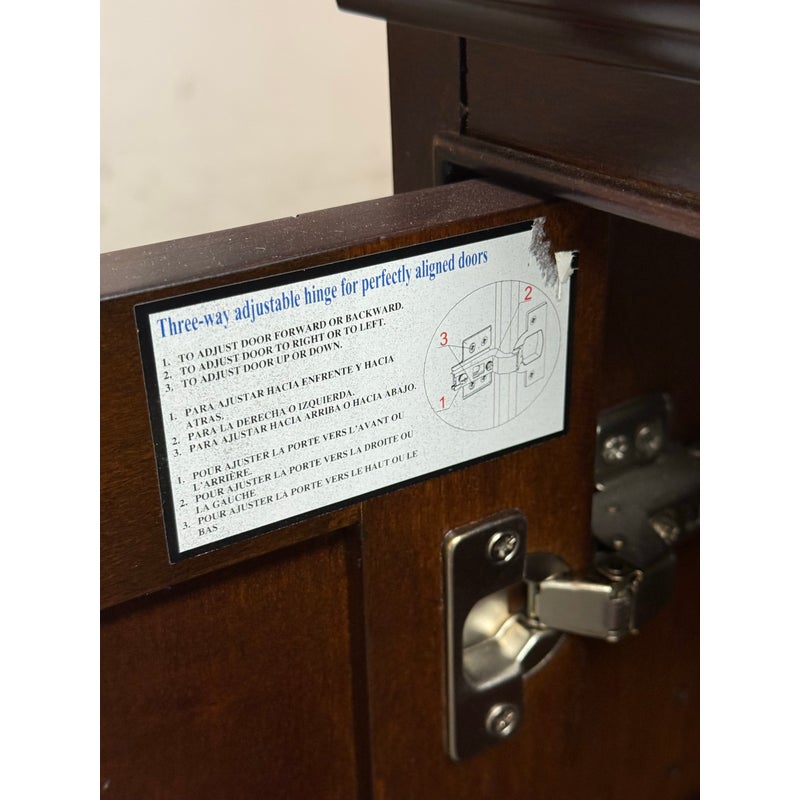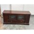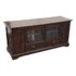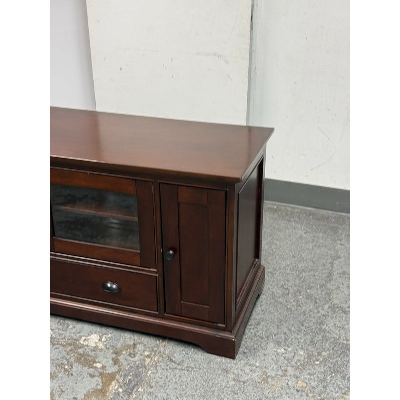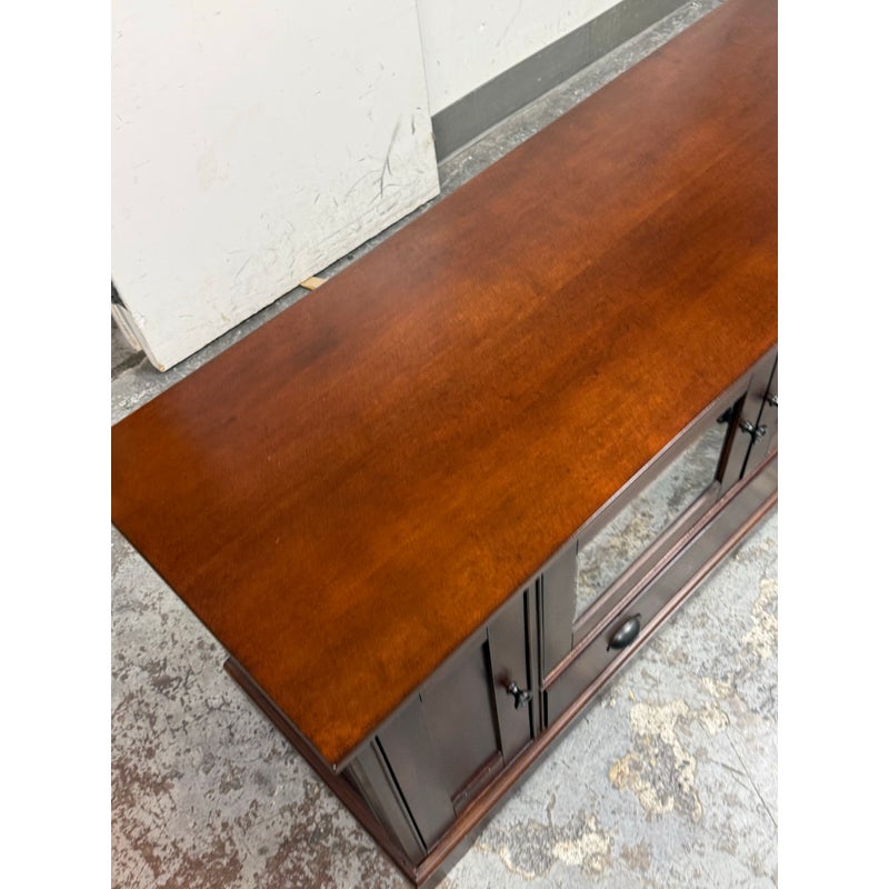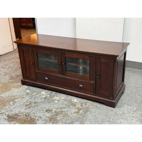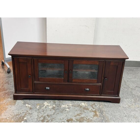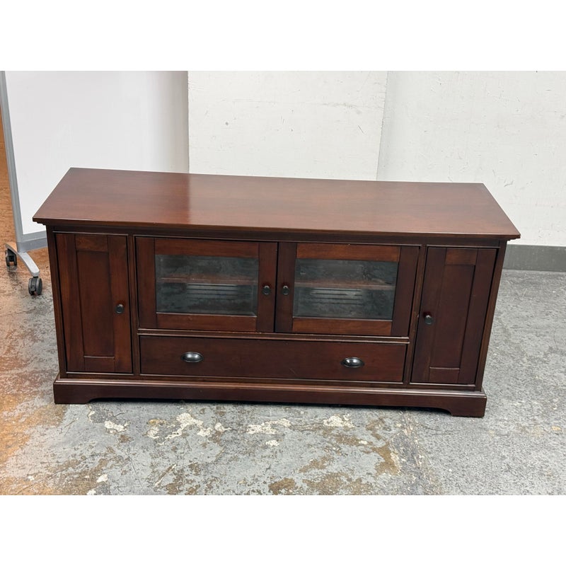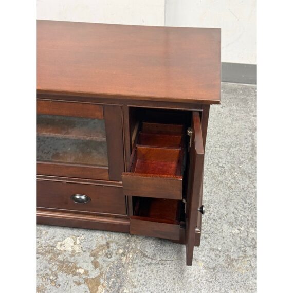 Design Plus Gallery presents a Lafayette Mahogany Media Cabinet from Crosley Furniture. This media cabinet has a traditional silhouette with paneled side doors, two glass front center doors, and a full width lower drawer accented by round and oval metal pulls. The interior includes adjustable shelving with wire management cutouts, along with enclosed compartments and open center storage behind glass doors. It is in good condition with visible and minimal wear from usage