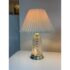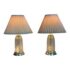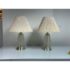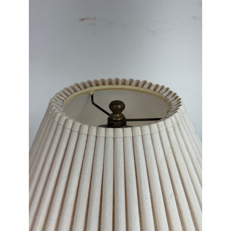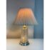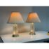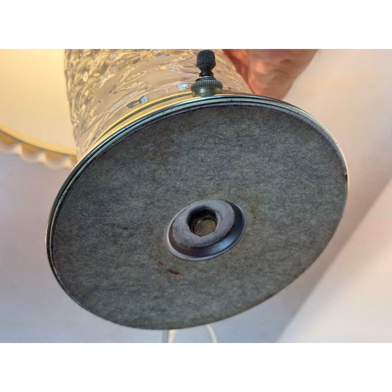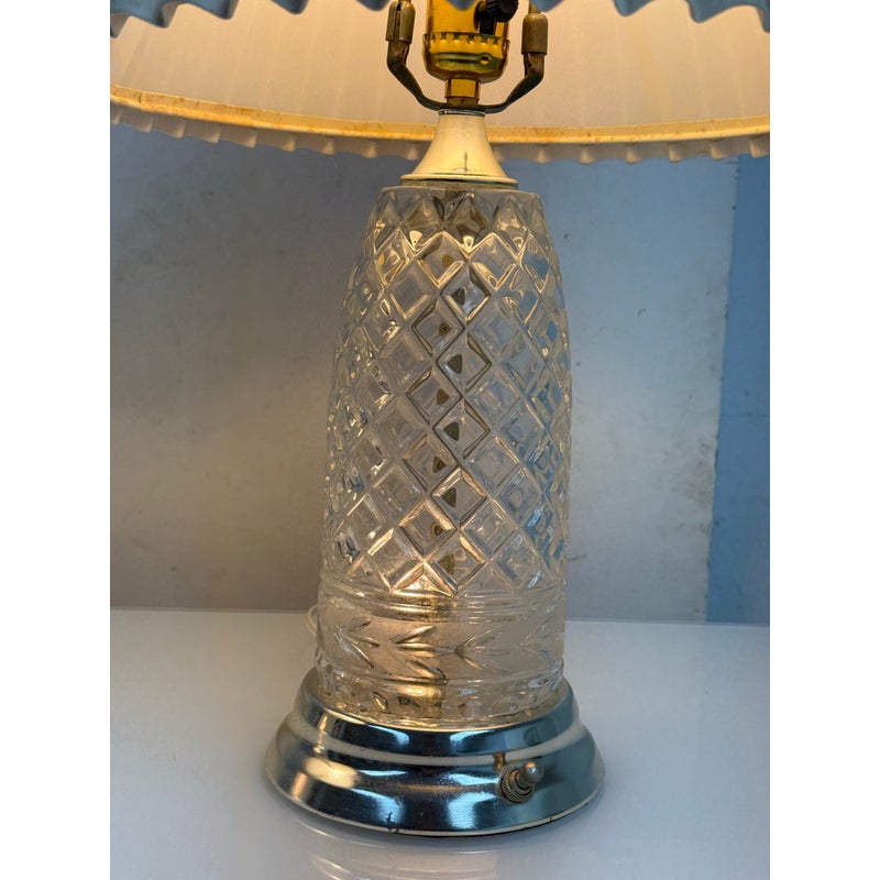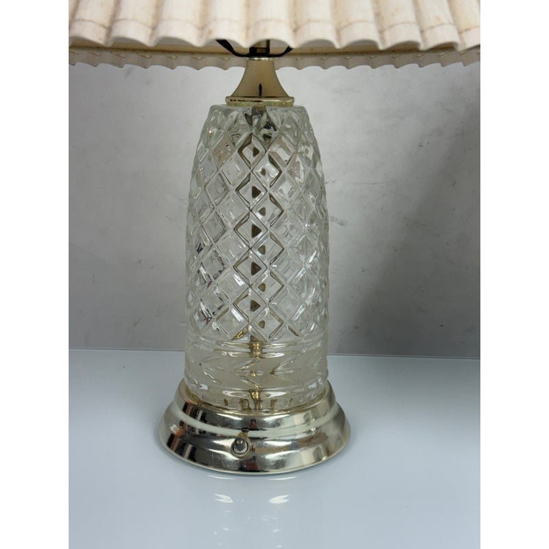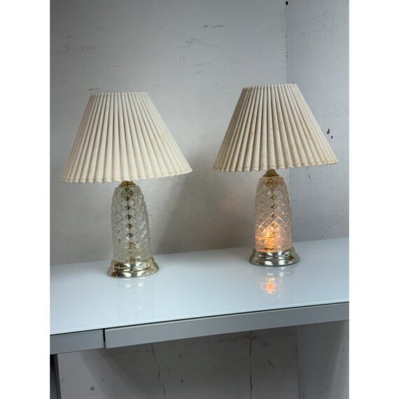 Design Plus Gallery presents a Pair of Cut Glass Table Lamps from Crystal-Clear Industries. Each lamp combines a clear-cut glass body with a polished metal base and pleated shade for a classic vintage look. The pair offers separate lighting controls, with a switch on the base for the inner glass illumination and switches at the top for the upper lighting, allowing multiple levels of light. The shades show visible wear and would benefit from replacement. They are in good condition with visible and minimal wear from usage. Made in Poland.