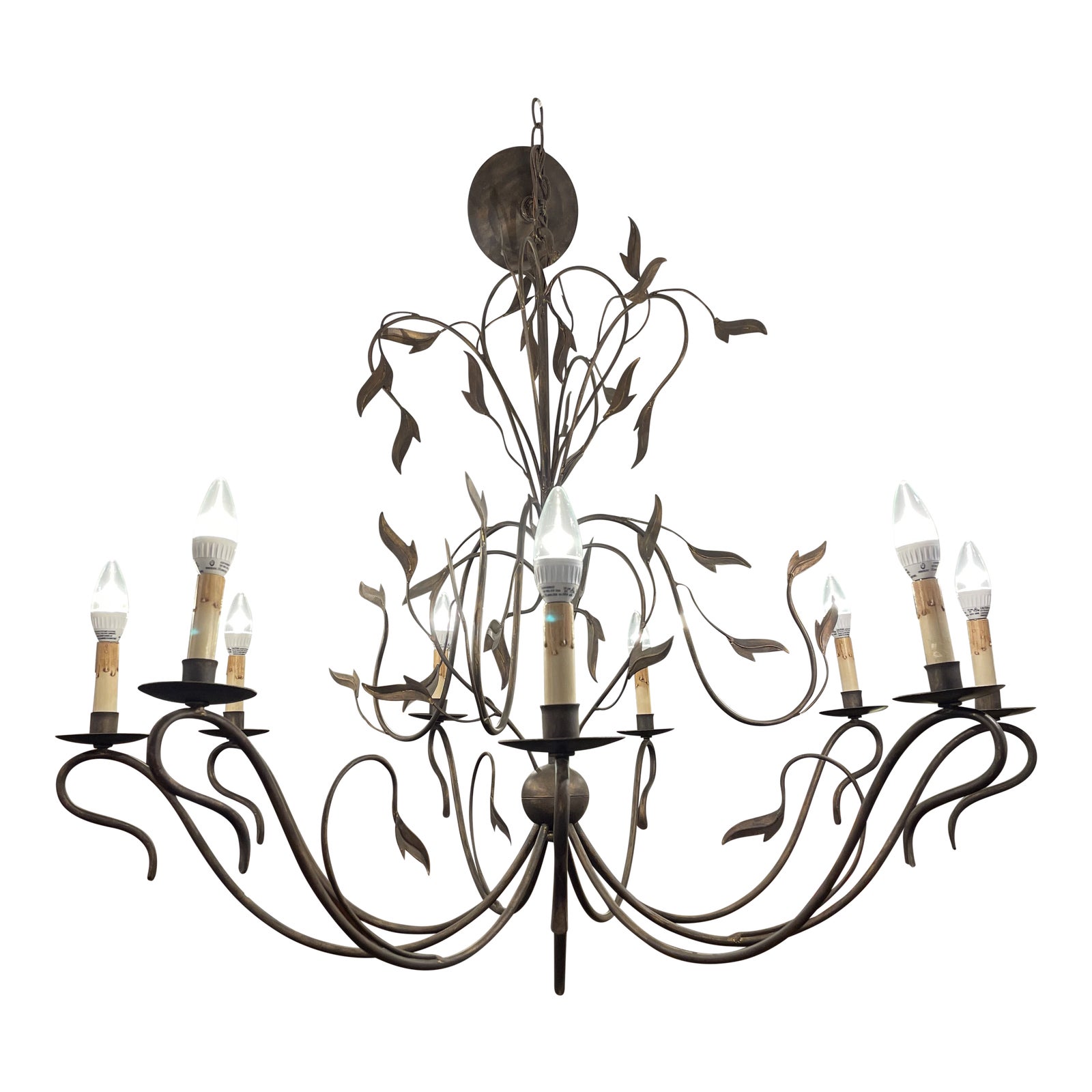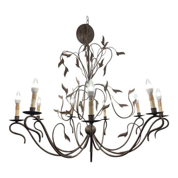 Design Plus Gallery presents a Currey & Company Arcadia 9 Light Chandelier in Hand Rubbed Bronze. Large and expansive chandelier is warm and inviting for any home with the perfect mix of form and function. Chandelier features hand rubbed bronze finish. Wrought iron frame is elegantly traditional and references a tree’s canopy with the leafs and vine like silhouettes.