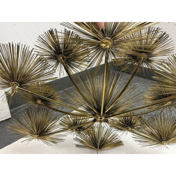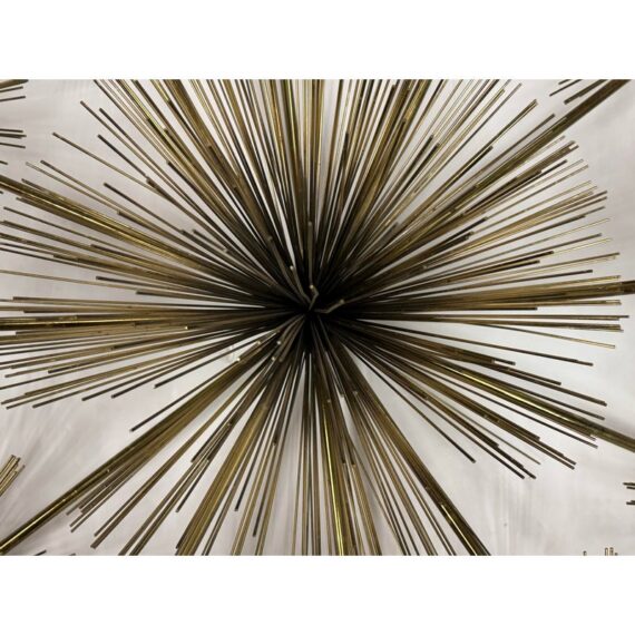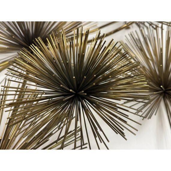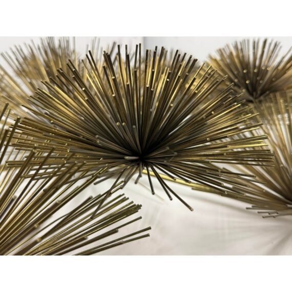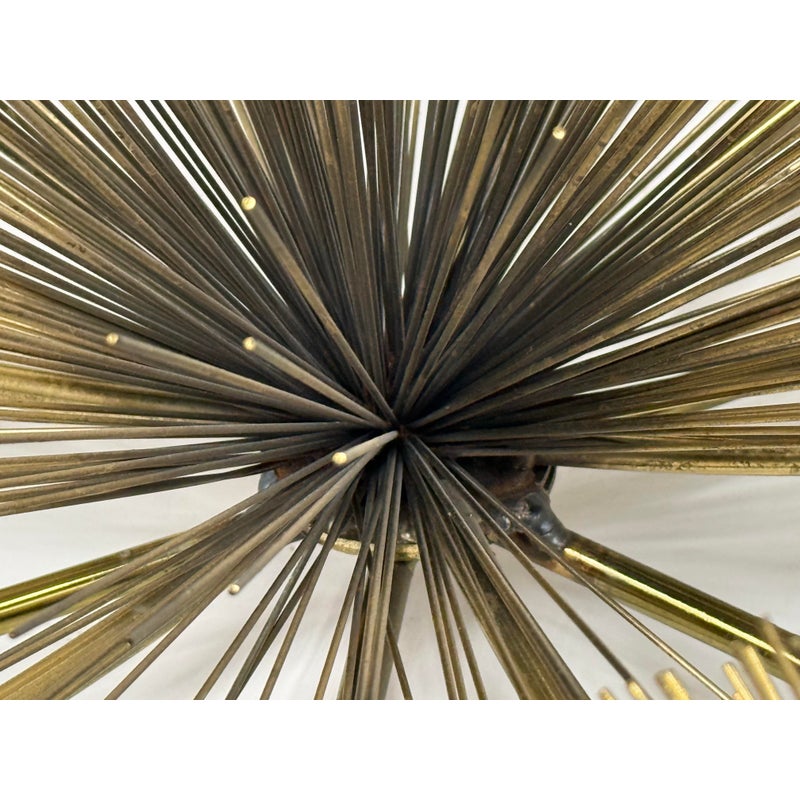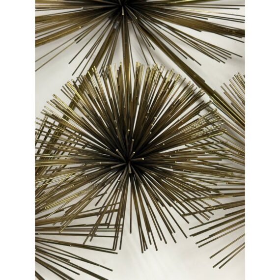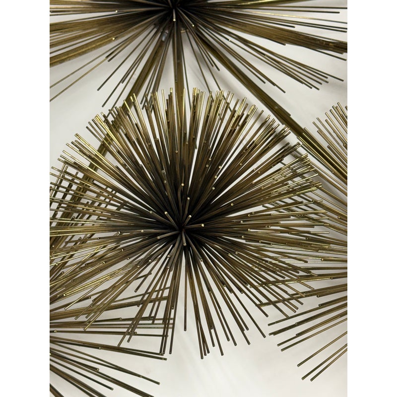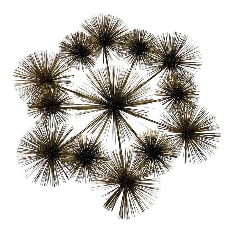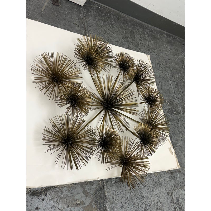 Design Plus Gallery presents a Vintage Curtis Jere Brass Sea Urchin/Dandelion Wall Sculpture. Composed of thirteen dandelion flower figures, also reminiscent of sea urchins, that radiates outward with slender brass rods. The composition is thoughtfully arranged in a symmetrical formation, with twelve starburst forms encircling a central focal piece. Its welded construction keeps each element securely in place. Designed for wall display, the sculpture is equipped with three back hooks for hanging. It is in good condition, with visible and minimal wear from usage.