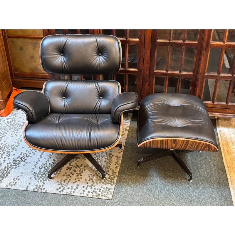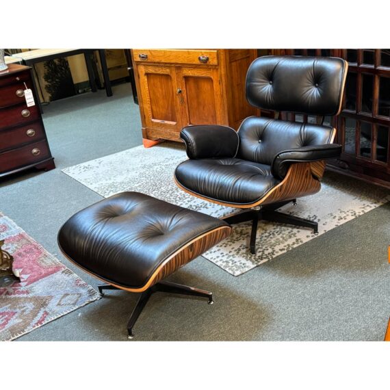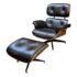 Design Plus Gallery presents a Set of Reproduction Imus Eames Chair + Ottoman from Curver K. The set is just like the icon Eames with similar dimensions, materials and comfort. The exceedingly stylish chair and ottoman has paliser bent wood veneer frame and a bonded leather upholstery. The chair and ottoman are both on swivel bases. The set is in good condition for their usage.