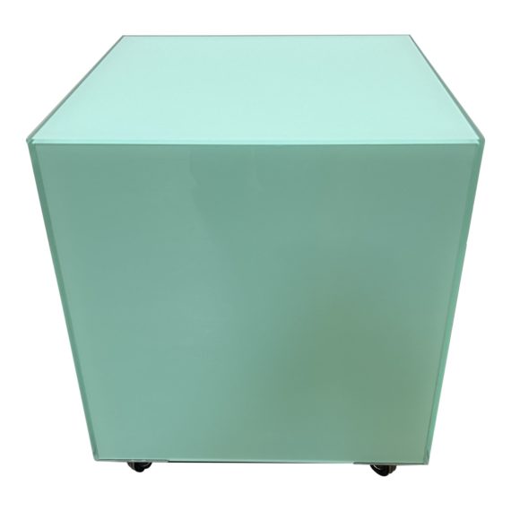 Design Plus Gallery presents a Custom Design Seaglass Rolling Cube from Curvet Italy. Have you found yourself with a need to have a versatile piece that easily can roll on your hardwoods to set items on while housing a things that need to be tucked away? This rolling cube from Italy will do all that while also adding in a blast of wonderful color. The cube is in good condition, minor wear. Made in Italy.