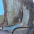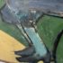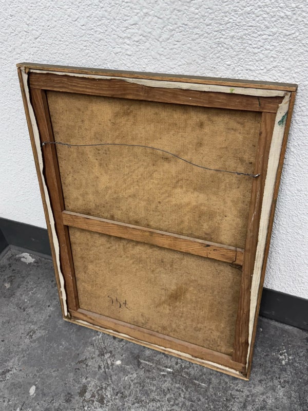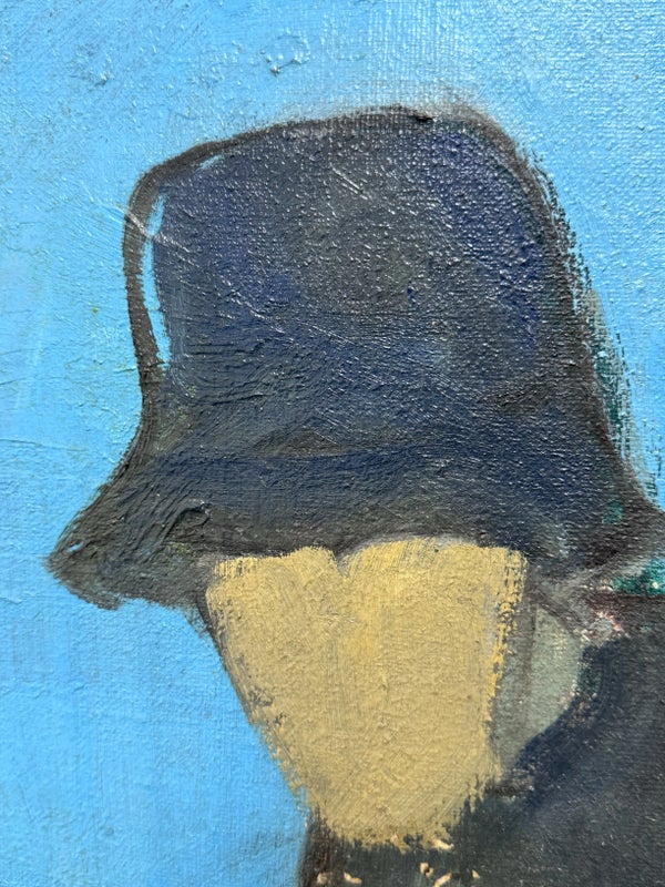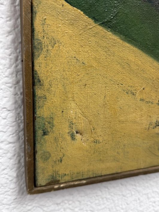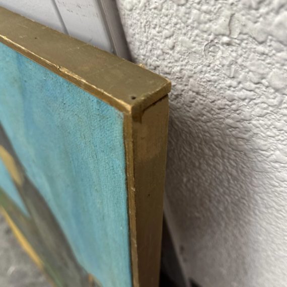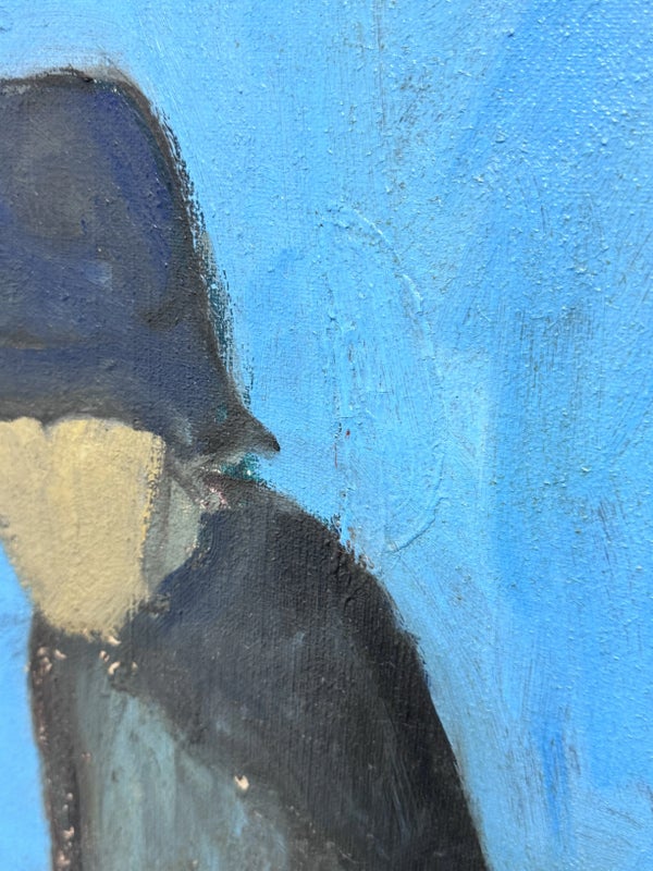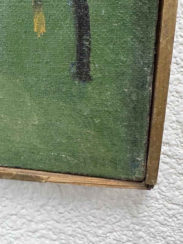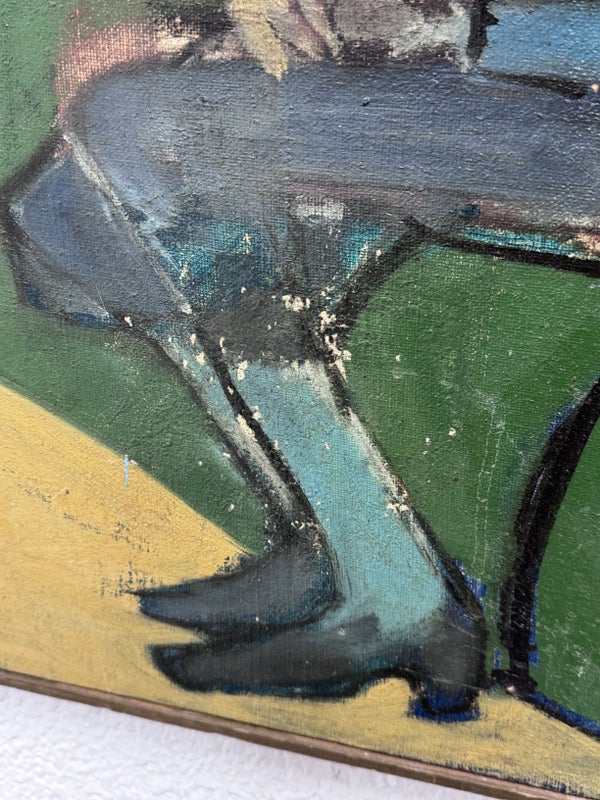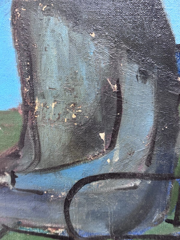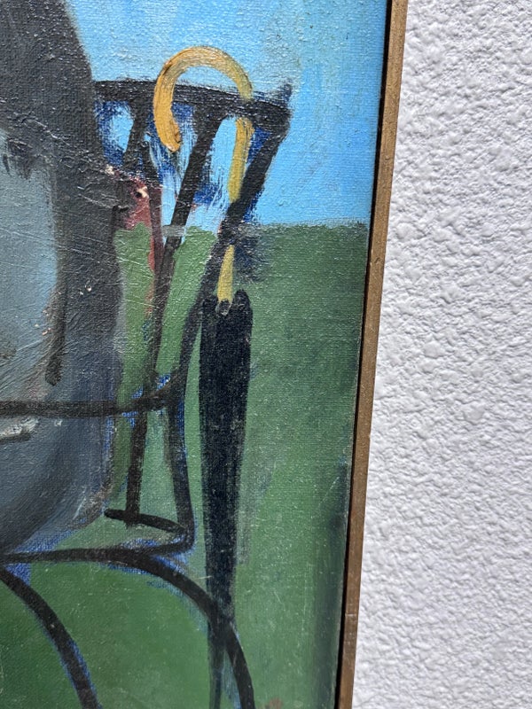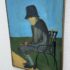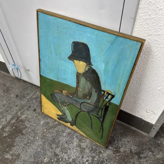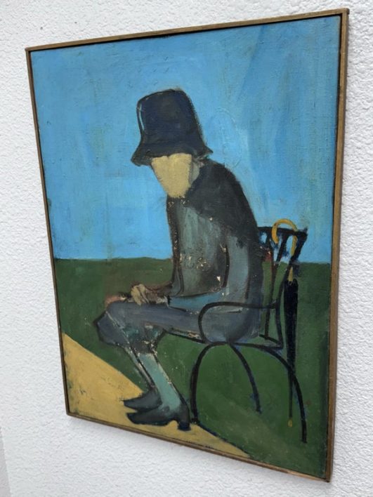 Design Plus Gallery presents a Custom Created Artwork, Signed on Back by Artist of a Person on a Park Bench. Bold primary colors of oil paint carry this in your face original art. The person on the bench is shrouded in mystery; elusive in all black except for turquoise socks. You can’t make out if the figure and it does seem to be incomplete as the face is featureless. You get the sense this is a well known person to the artist. Is in good condition for its age with wear that is consistent with use.