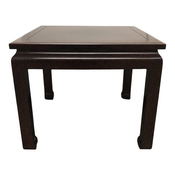 Design Plus Gallery presents a custom side table inspired by Traditional Asian Design. Sleek lines with minor curves. Crafted of solid woods and veneers. Slight discoloration on center of middle of table. Suitable as a side table or nightstand.