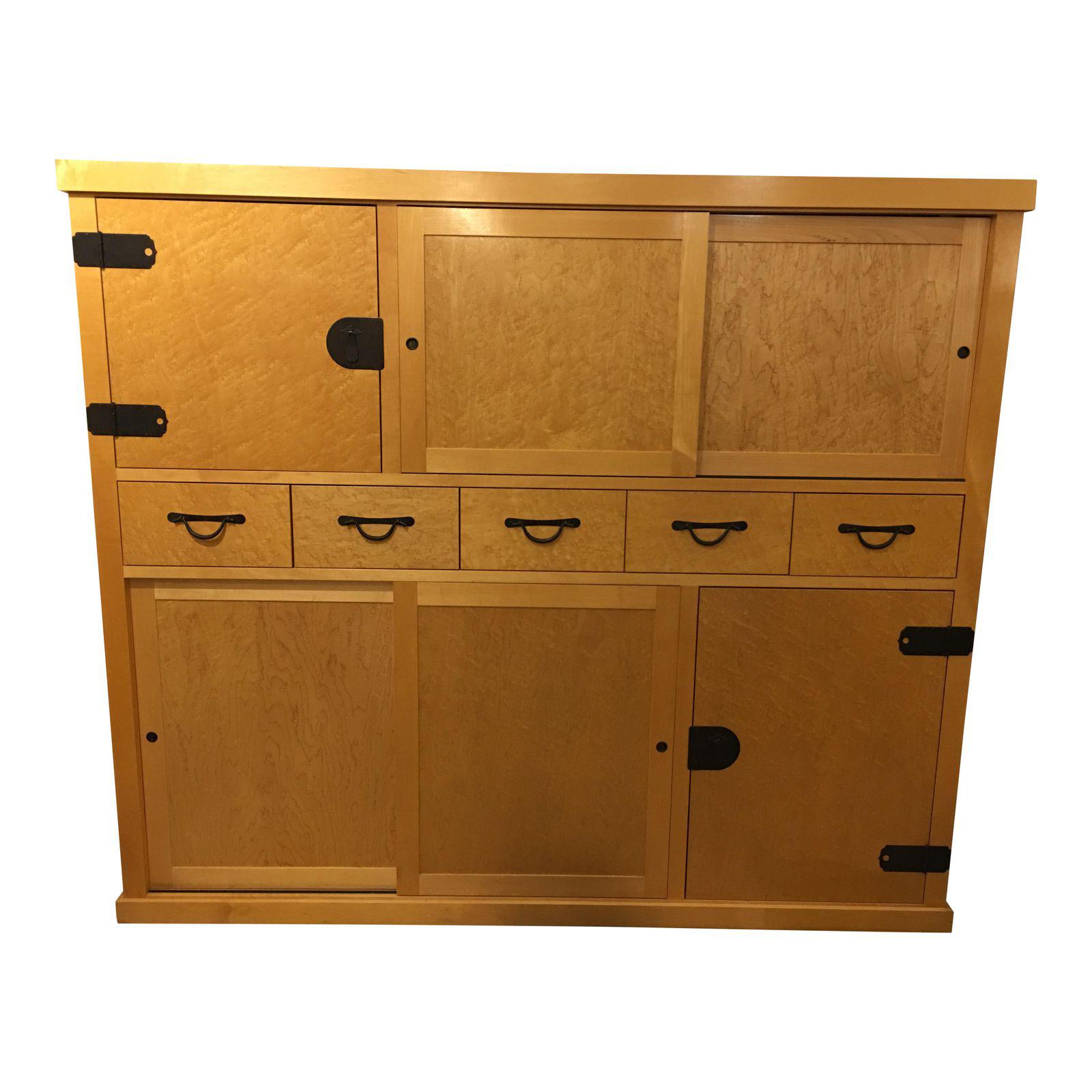Design Plus Gallery has a custom designed Tansu. Beautifully crafted in a Birdseye Maple. Many compartments with pullout drawers and sliding doors. Some ware are noticeable on the surface, there was one a small potted plant on it. The hardware is iron. Four sliding doors and two swing doors reveal inner adjustable shelving. There are five pullout drawers that each has a permanent divider. This is a lovely large and heavy storage piece. Great addition for any room that needs storage.