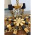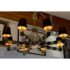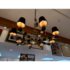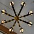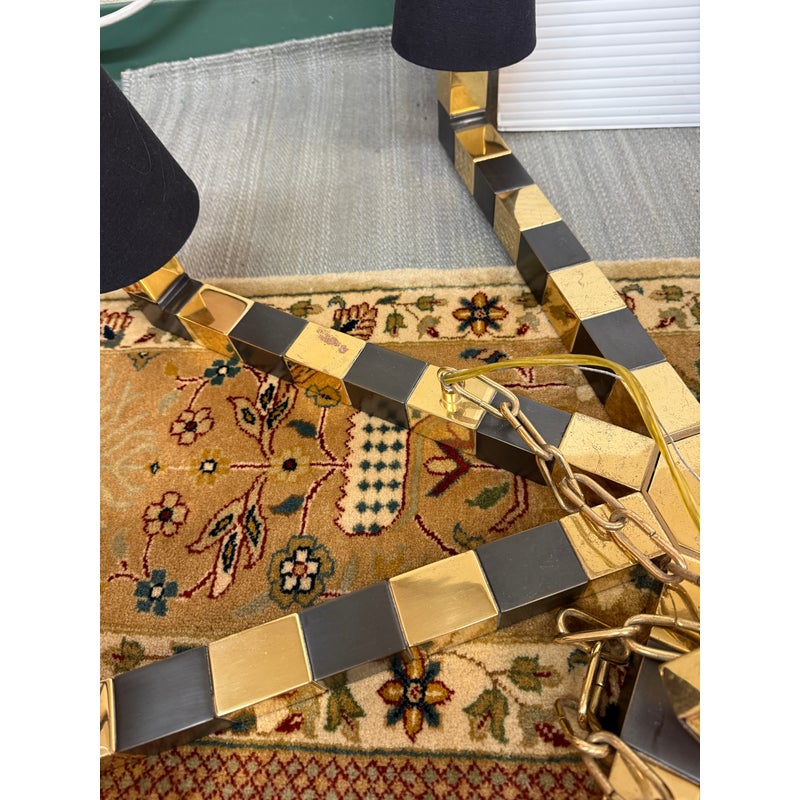 Design Plus Gallery presents an Eight Light Chandelier. The chandelier was originally housed in an elegantly designed restaurant. It has alternating black and brass arms, outstretching from a brass center with chains. At each end of the arms is the light socket with black fabric shades. It’s in good condition with visible patina and minimal visible wear from use.