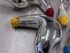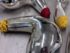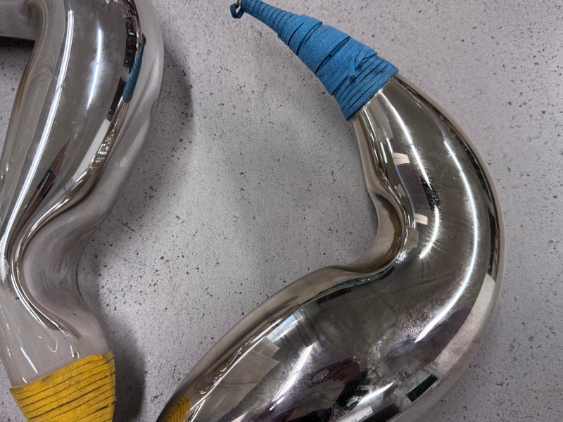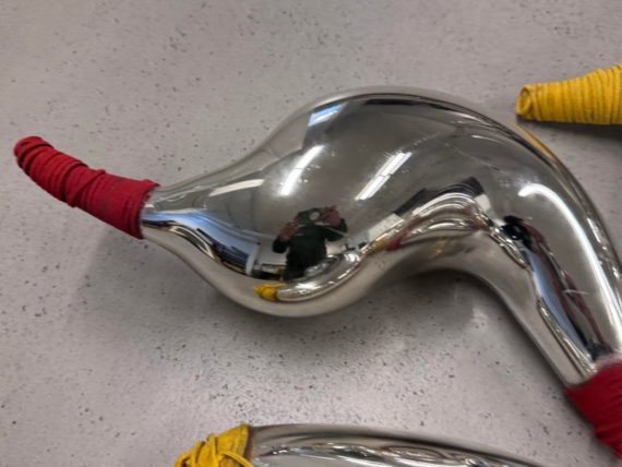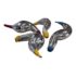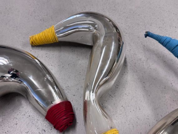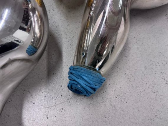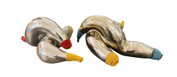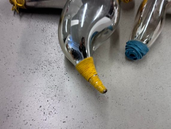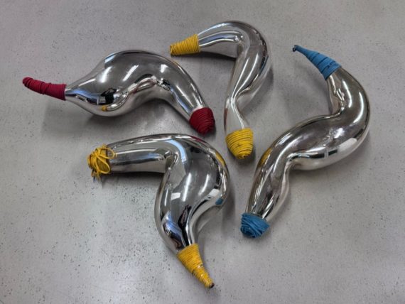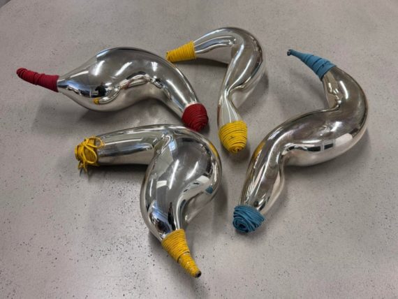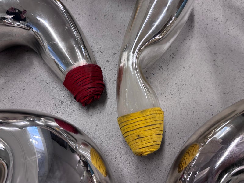 Design Plus Gallery presents a Set of Four Blown Glass Artist Made Chrome Sculptures with Suede Ties. They are bean, pod like vessels tied with vibrant primary colored suede ties. They look great on their own and perfectly display stacked upon one another. These are all in good condition with wear to fabric ties, some of which are unraveling.