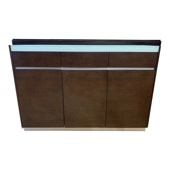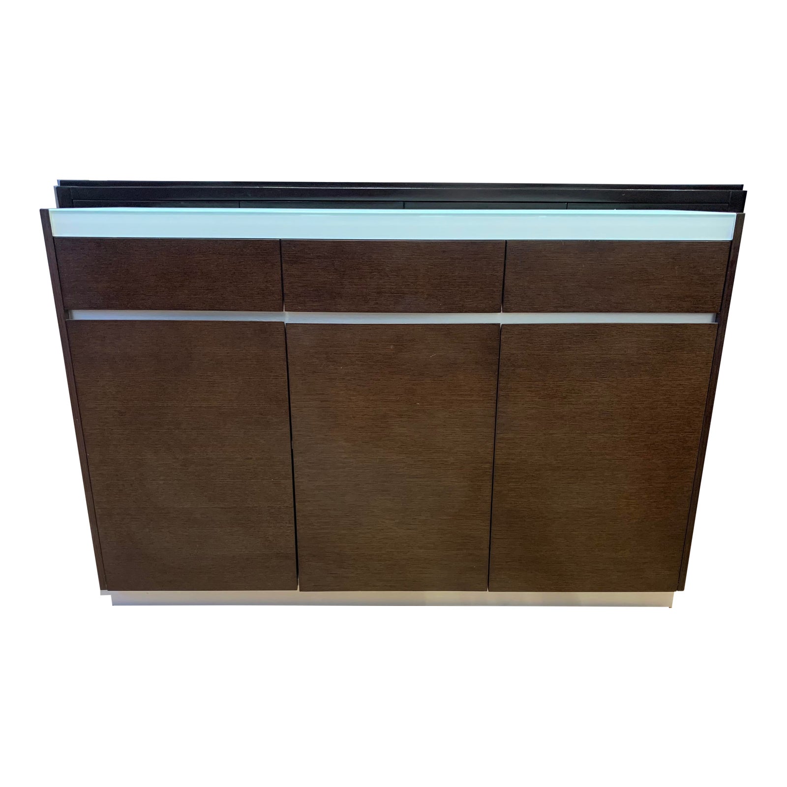 Design Plus Gallery presents a Custom Buffet Cabinet + Pullout Tray. Warm wedge veneer is combined with stainless steel details and resin composite top. Pullout tray offers convenient storage for utensils and silver. Minor wear on frame. Adjustable shelving adds flexibility beneath doors.
