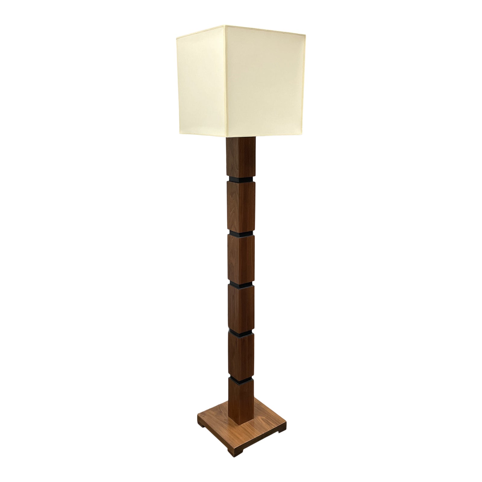 Design Plus Gallery presents a Custom Wood Cubist Floor Lamp. Wood base is echoed in the rectangular column with reliefs to form a block like configuration. Rectangular shade mimics the base and shows some wear. Floor lamp is in good condition.