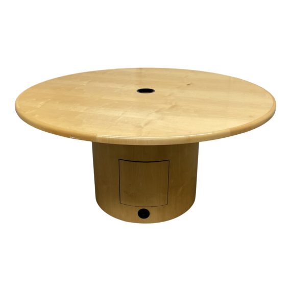 Design Plus Gallery presents a Contemporary Round Maple Conference Table. Maple veneers surround the welcoming form with a softly finished table top. Pedestal base has convenient electrical output for working in groups. Minor wear on surfaces, table is in good condition.