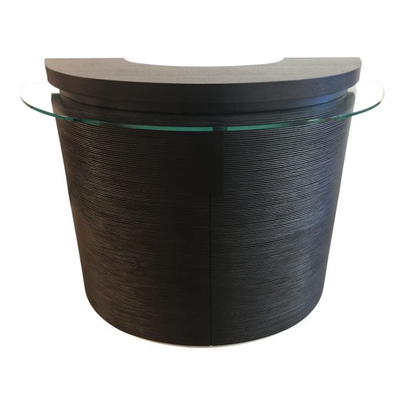 Design Plus Gallery presents a curved bar. Constructed go mahogany woods and veneers in an ebony finish. A curved glass extension outlines the frame. The back is open with 12 cubbies that can hold up to 60 bottles. Minor wear. Small in size, yet striking in design and suitable for small spaces.