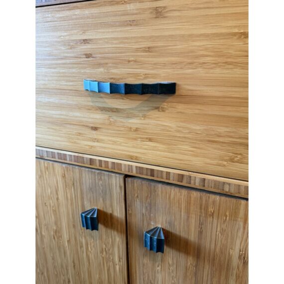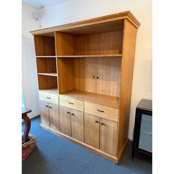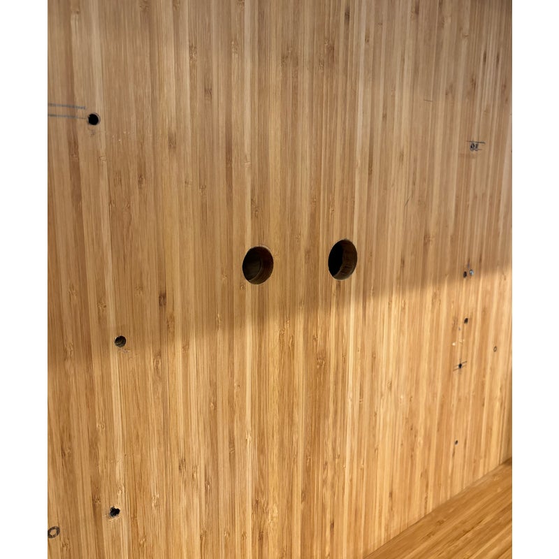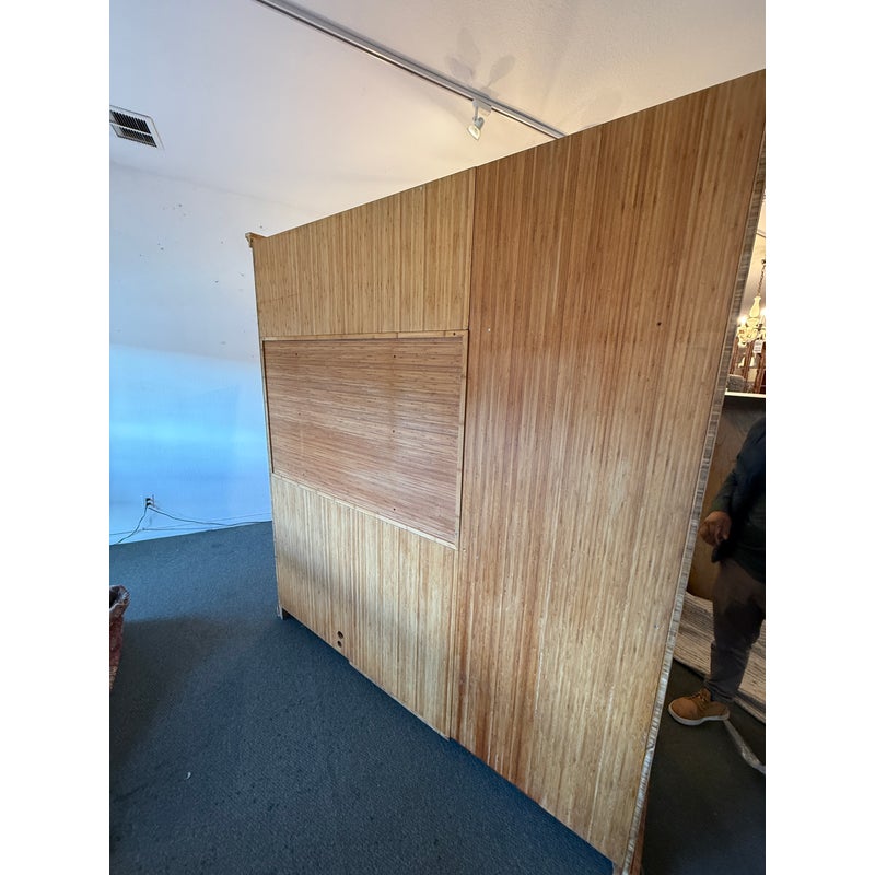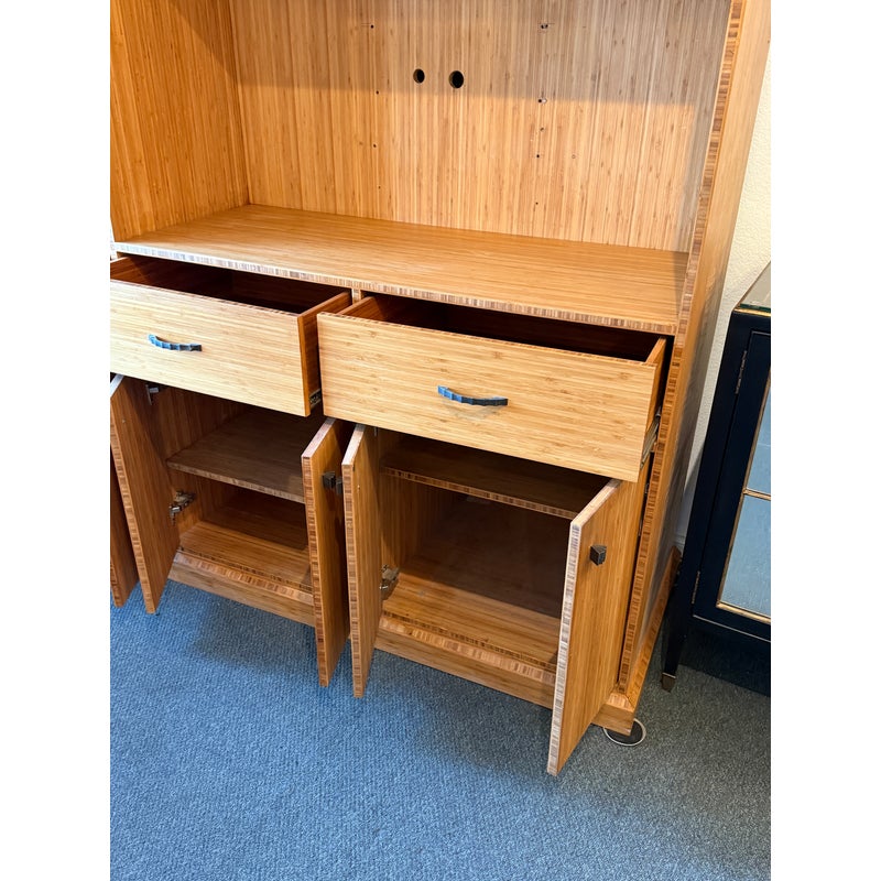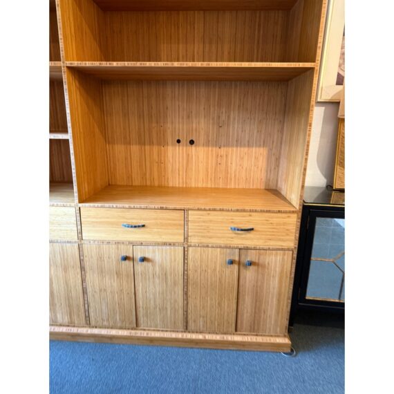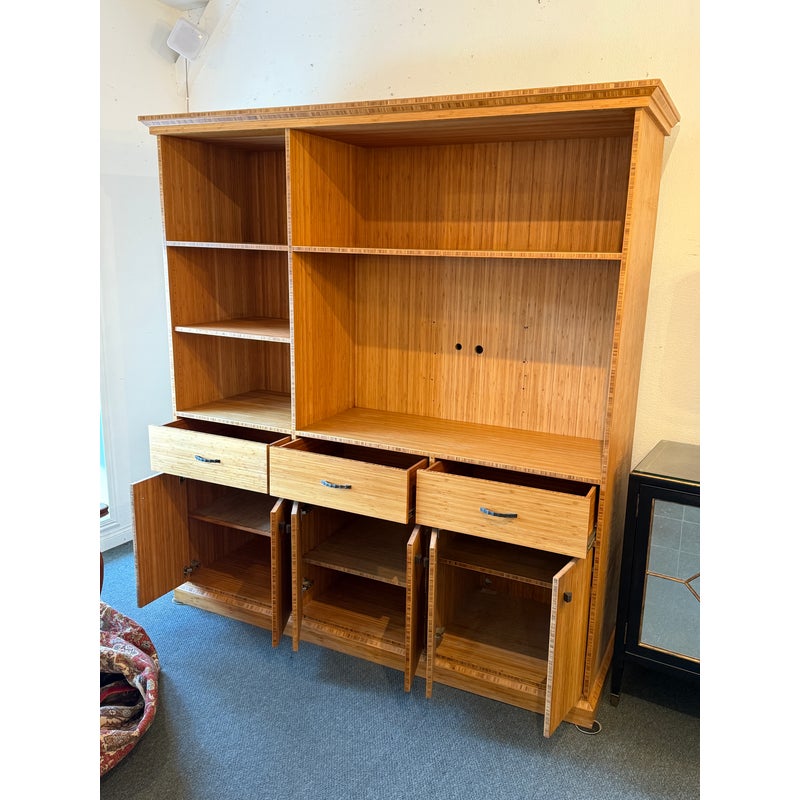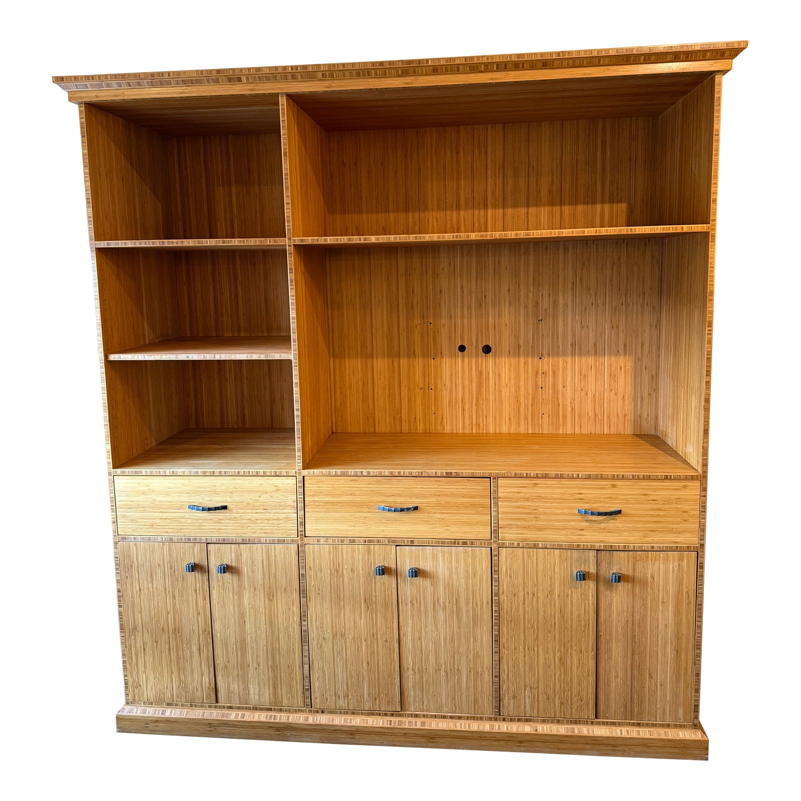Design Plus Gallery presents a Custom Media or Display Cabinet by Bamboo Kitchens. Featuring both the natural bamboo grain and end grain details, this one-piece organic cabinet offers ample open display and closed storage. Large fixed shelf at top and adjustable shelving makes this beauty fit your treasures perfectly. Cast metal pulls. Light surface wear; diy tv mounted previously; condition is good for age and use.