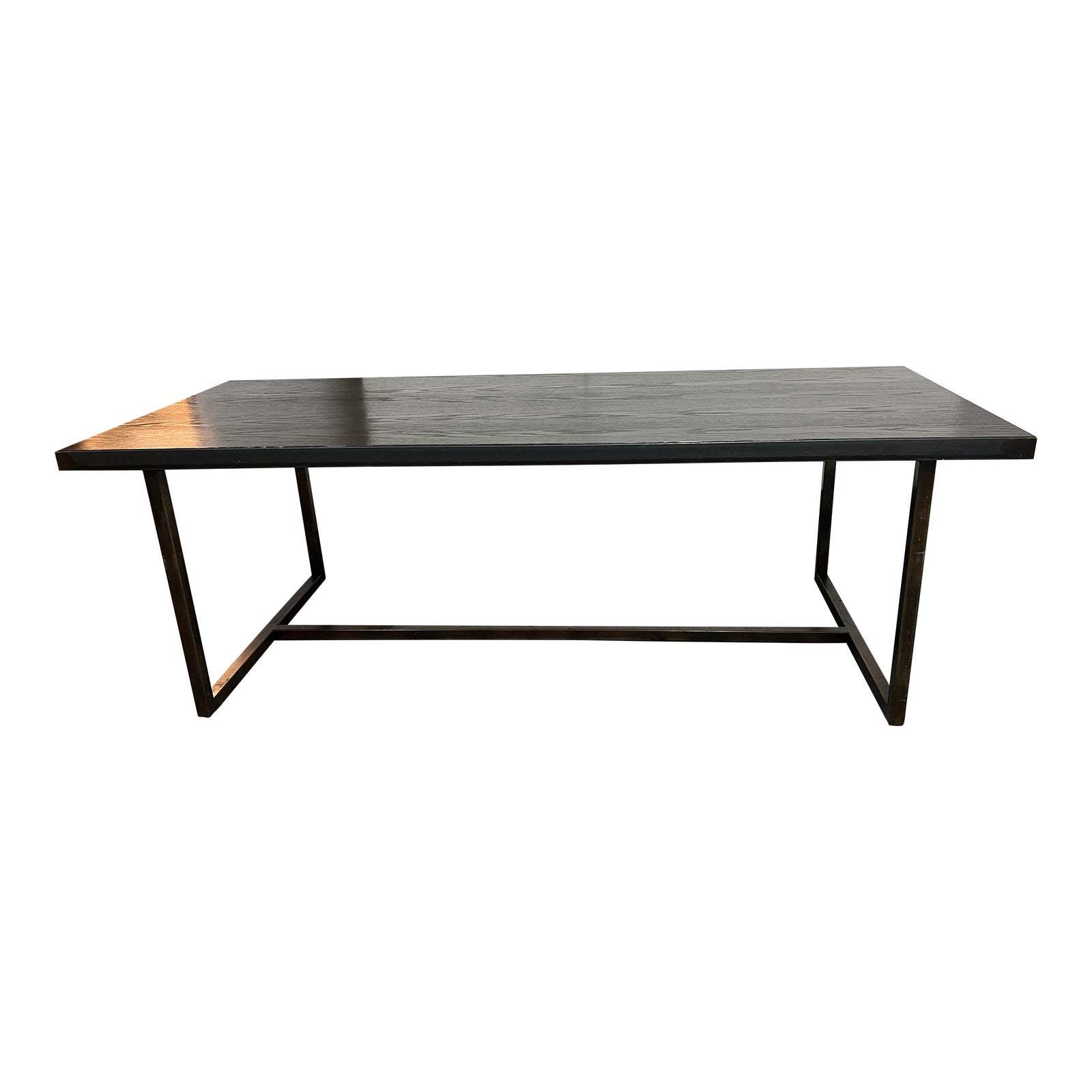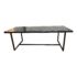 Design Plus Gallery presents a Custom Design Black Wood + Metal Wrap + Base Teal. A wood top + seating bench is in a black finish. Wrapped in a metal frame with legs. Visible and minor wear form usage.