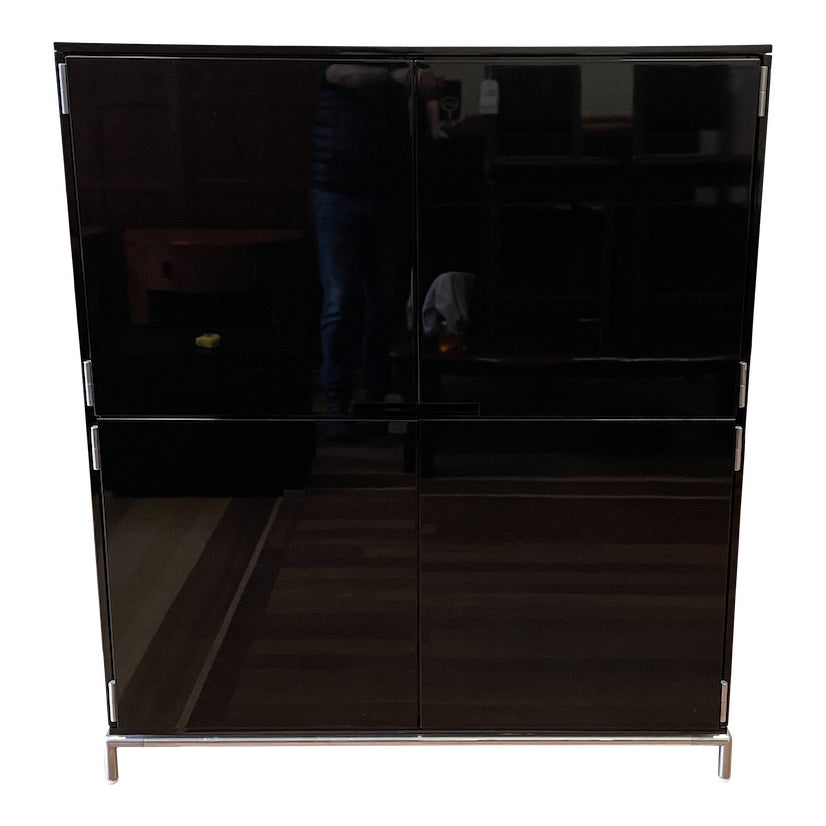 Design Plus Gallery presents a Contemporary Custom Design Black Lacquered Four Door Cabinet. Large unit utilizes a quadrant of storage in a clean and contemporary black box. Storage sits upon an oiled chrome pedestal base. Pulls are integrated into the center of the quadrant. Visible wear through out the surfaces, and there are no shelves on the interior.