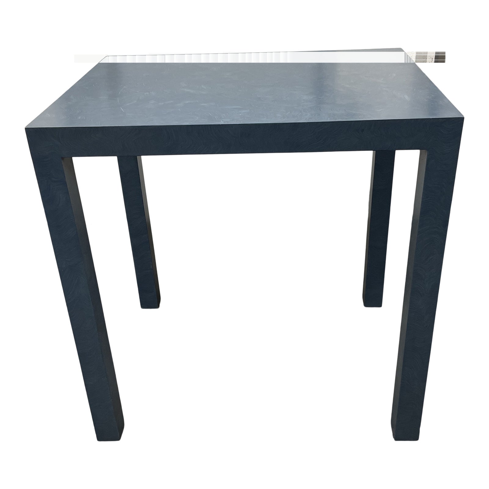 Design Plus Gallery presents a Custom Blue Marble Wave Veneer Parsons Side Table Unique proportions gives height and a splash of blue to any space for lighting, accessories or serving. There is ample space within the parsons like silhouette for storing baskets and layering. The veneer has an Italian like marbling in an ocean blue. Minor wear through out, side table is in good condition.