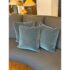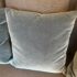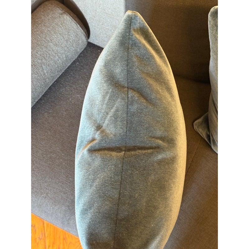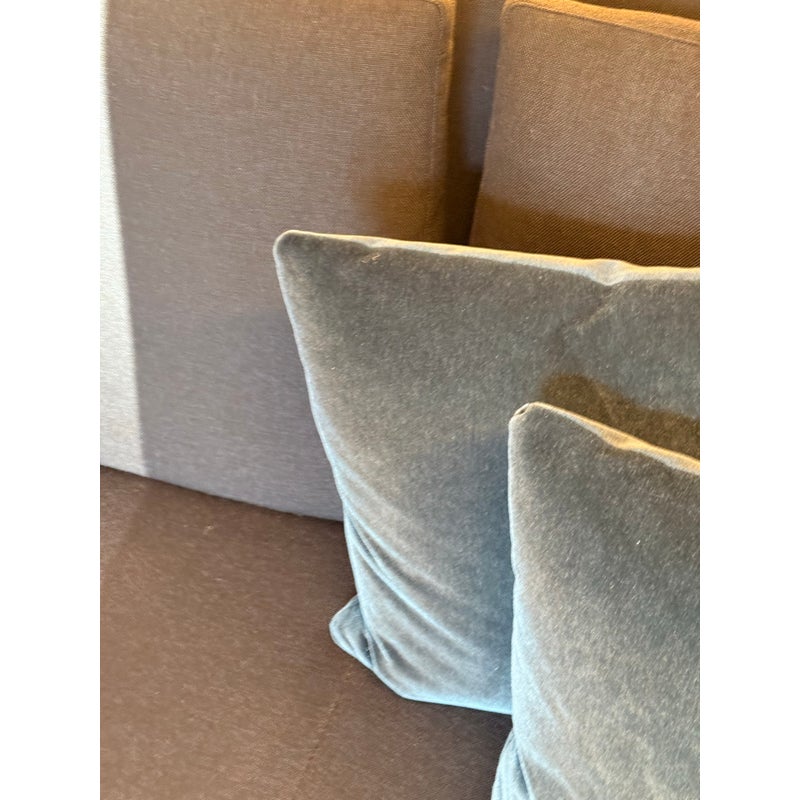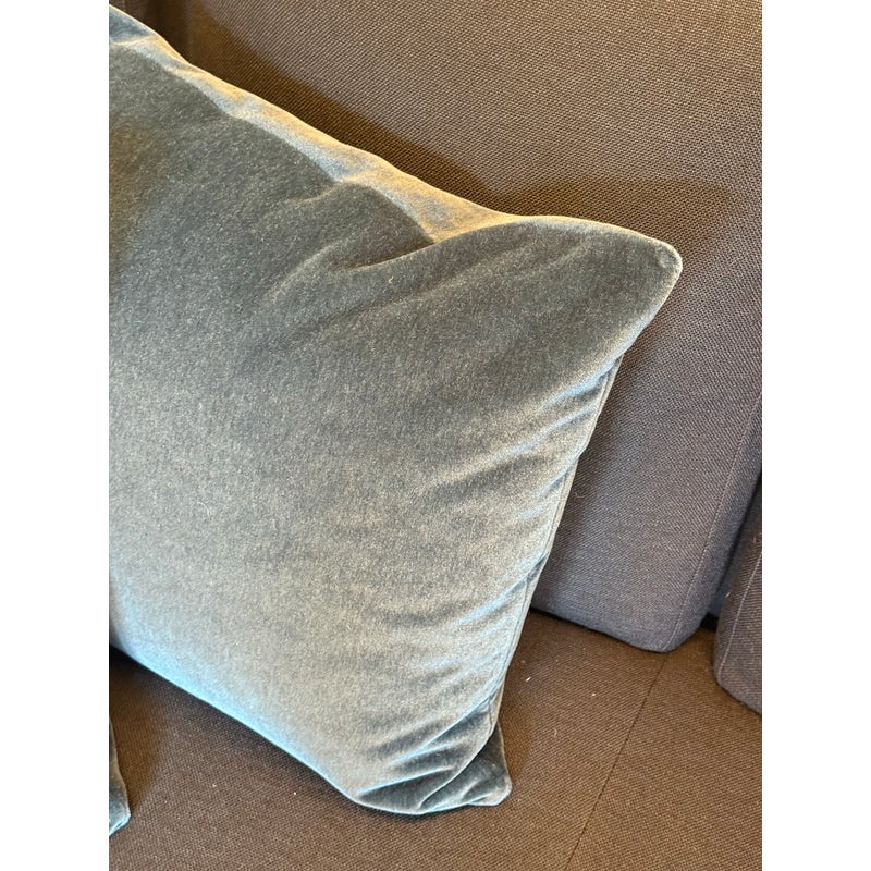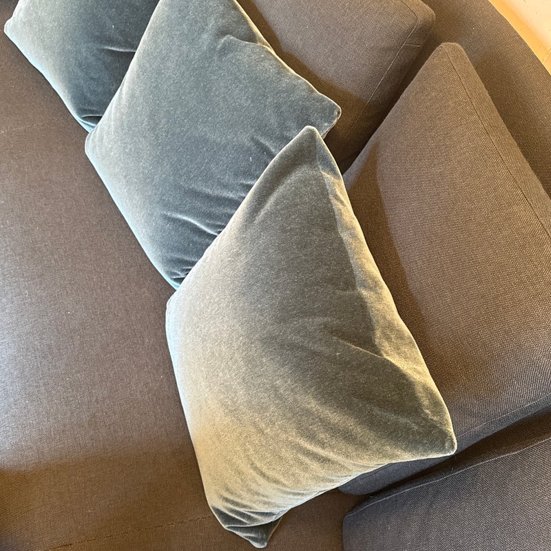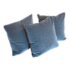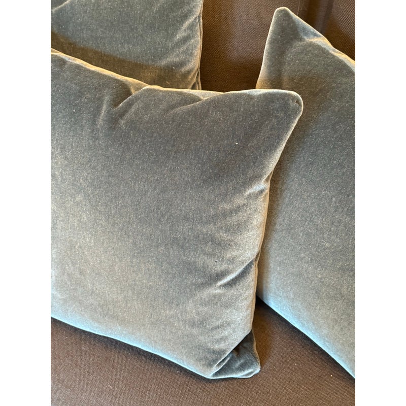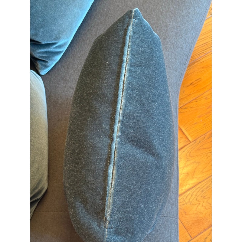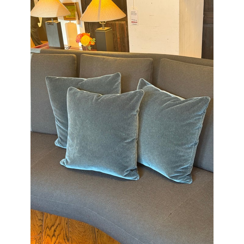 Design Plus Gallery presents a Set of Three Custom Design Vintage Blue Velvet Pillows. Each pillow is covered in a deep blue velvet textile with a soft nap that shifts slightly with the light, and each has a tailored square silhouette for a cohesive set. The pillows are filled for supportive loft and finished with stitched seams along the edges for a neat profile. They are in good condition with visible and minimal wear from usage. Made in the USA.