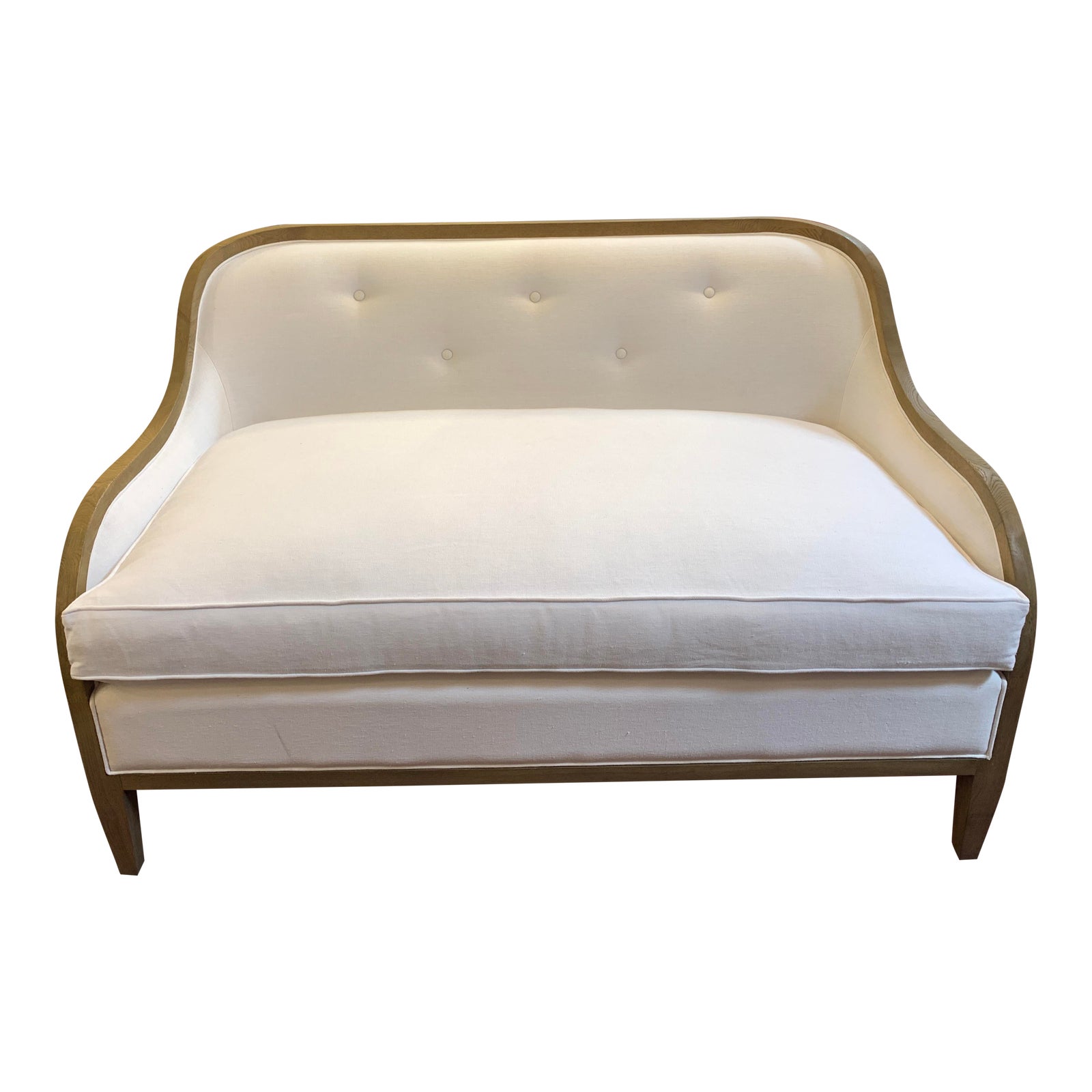 Design Plus Gallery presents a New Custom Design Brooklyn Sofa. Framed in gentle curves of natural wood, this elegant washed linen settee is detailed with the lightest of button tufting. Down filled seat cushion invites comfort.