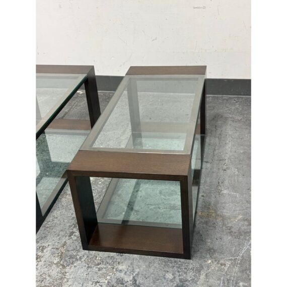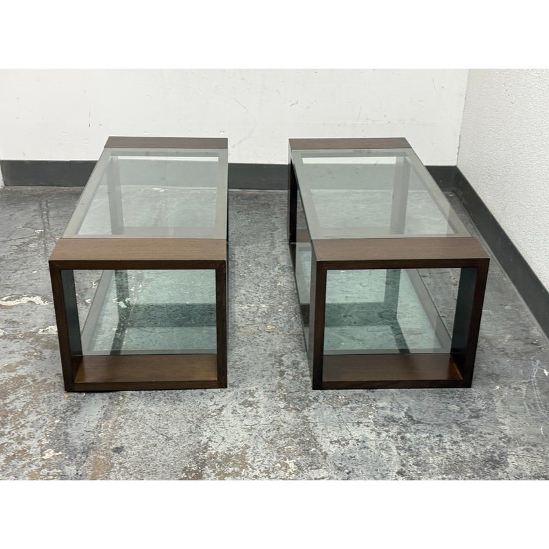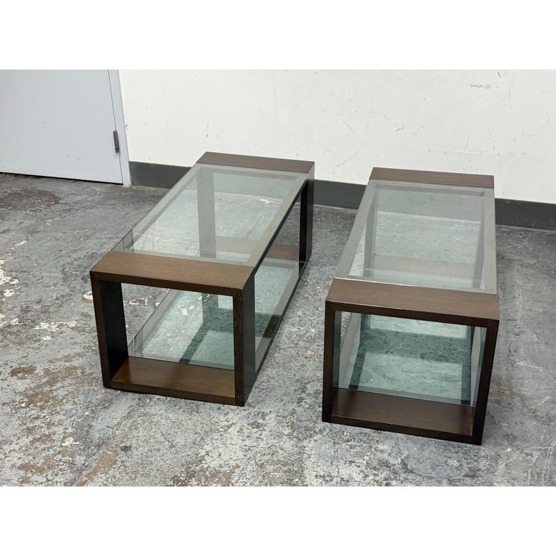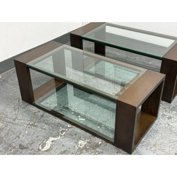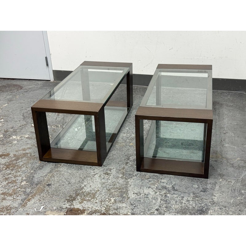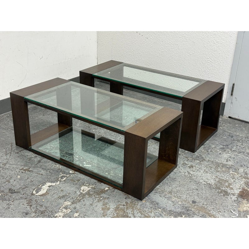 Design Plus Gallery presents a Pair of Ceruse Finish Wood Coffee Table with Glass Inserts of Contemporary + Custom Design. Sophisticated and nicely designed, these coffee tables have an interesting look and feel. There are two pieces of thick, tempered glass that connect both of their wooden frame ends. They have a high design with their sculpted and architectural presence. It is in good condition with minimal wear for its usage. Made in California, USA.