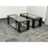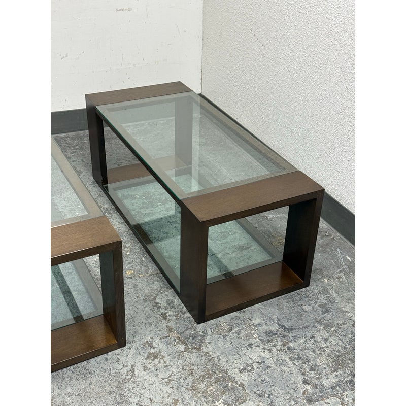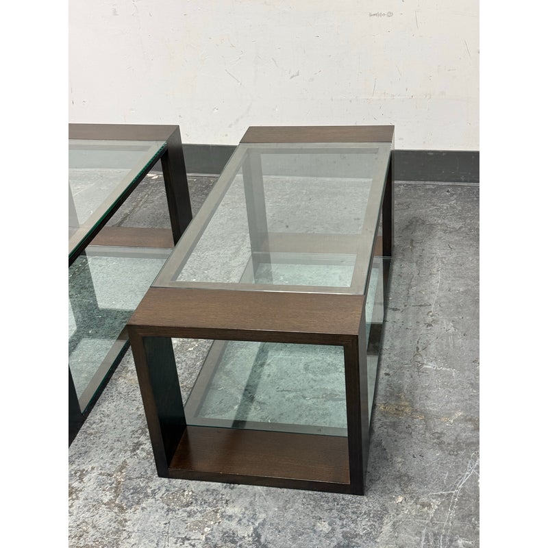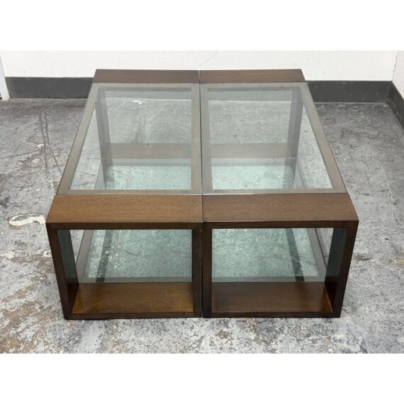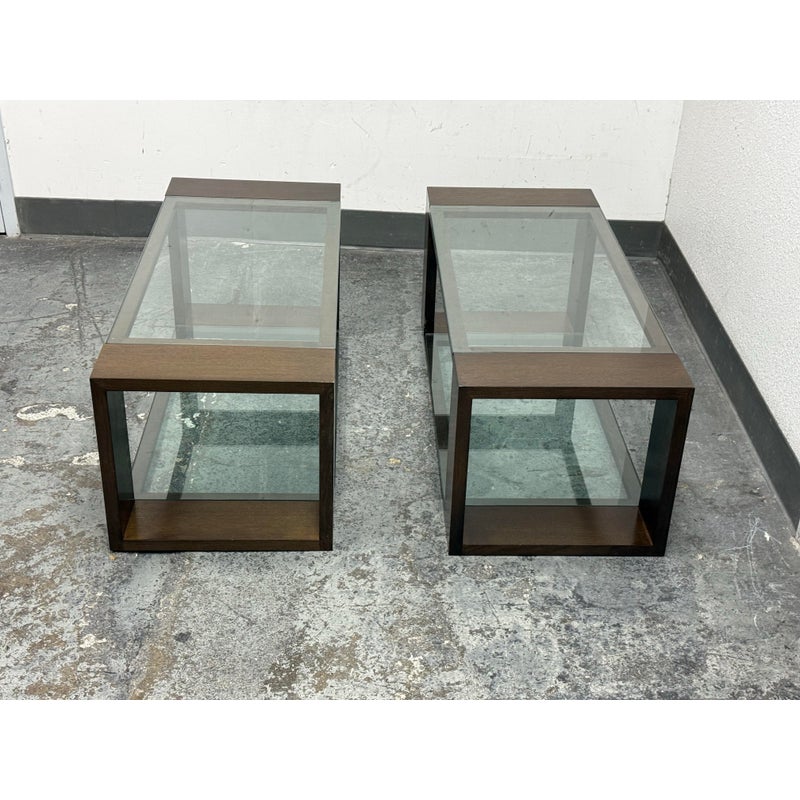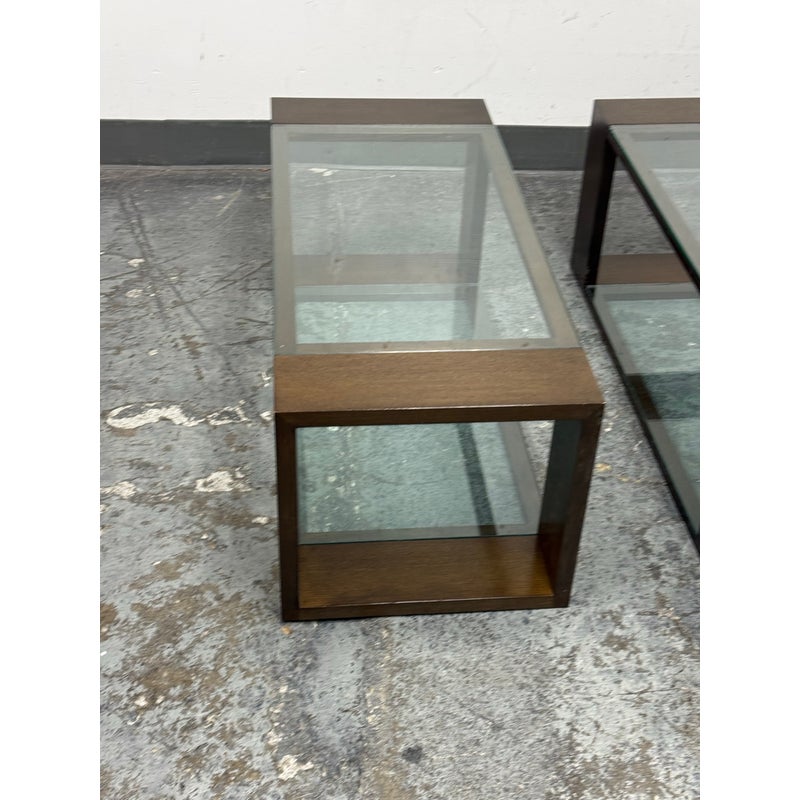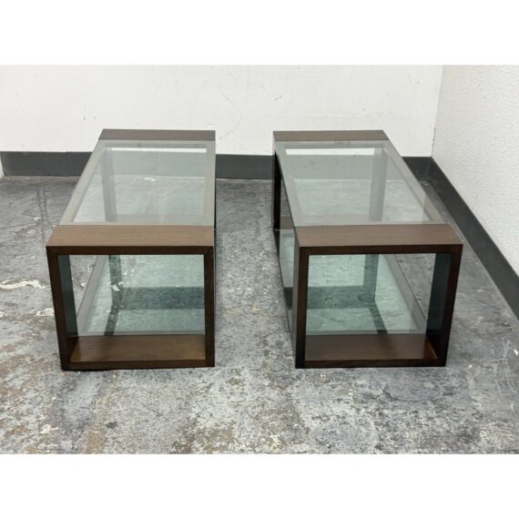 Design Plus Gallery presents a Pair of Ceruse Finish Wood Coffee Table with Glass Inserts of Contemporary + Custom Design. Sophisticated and nicely designed, these coffee tables have an interesting look and feel. There are two pieces of thick, tempered glass that connect both of their wooden frame ends. They have a high design with their sculpted and architectural presence. It is in good condition with minimal wear for its usage. Made in California, USA.