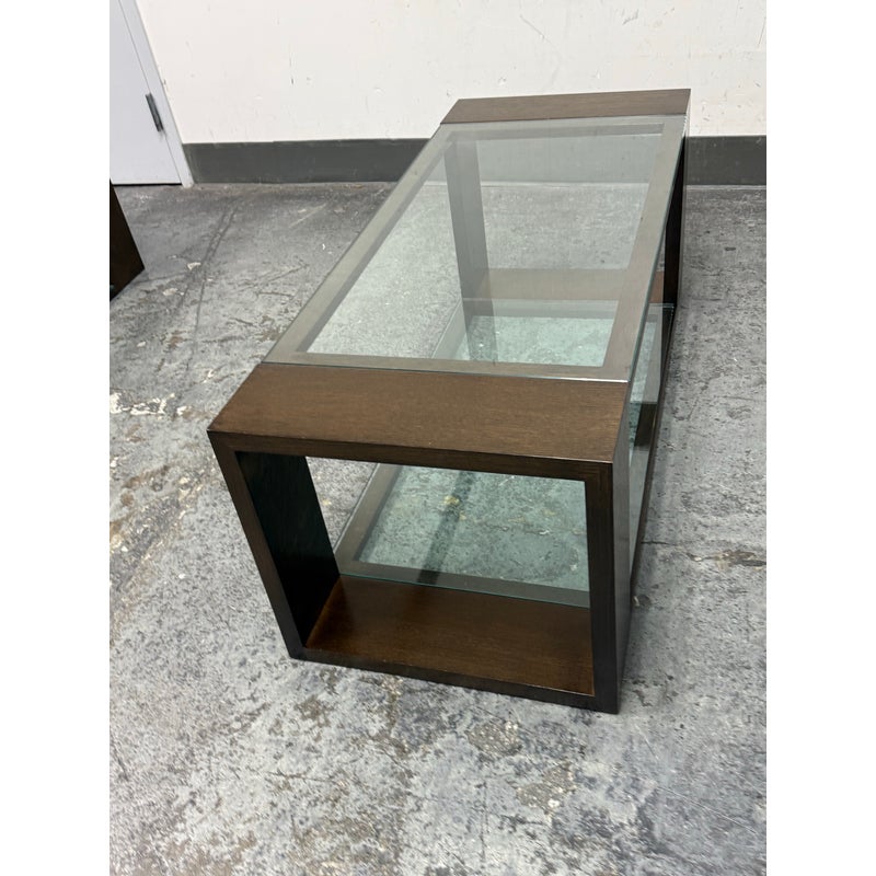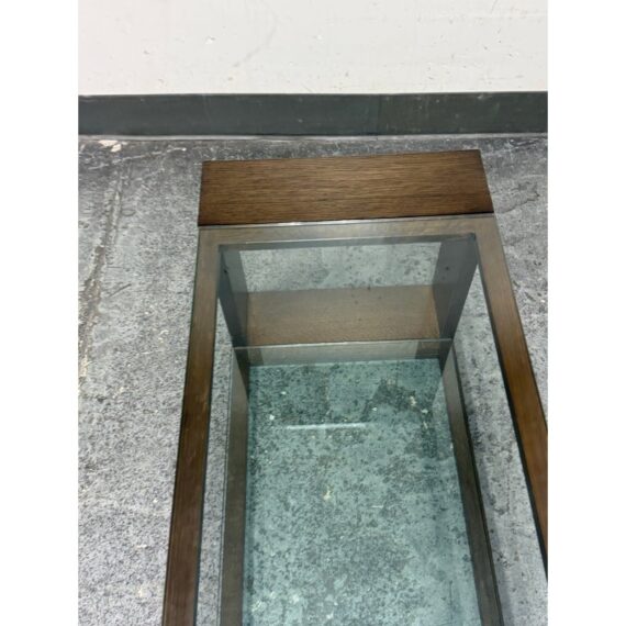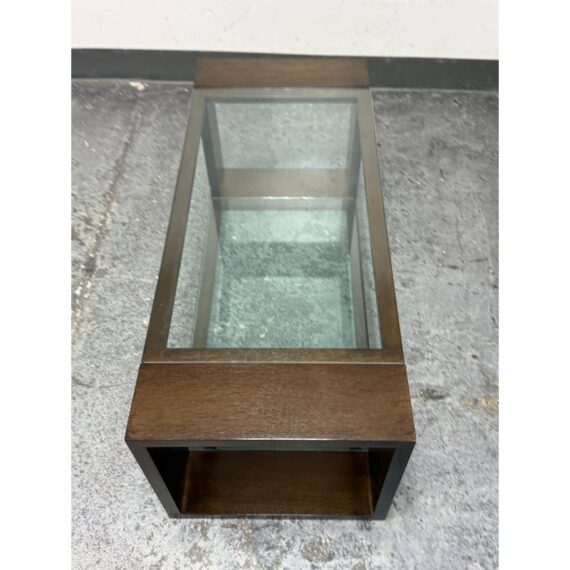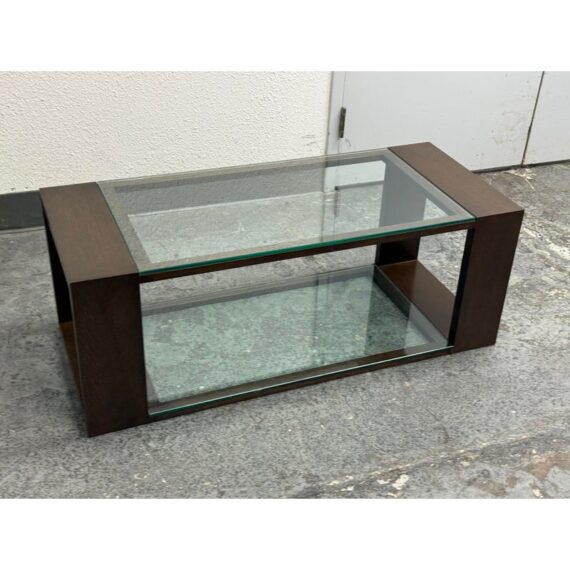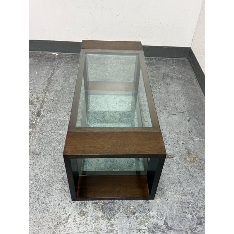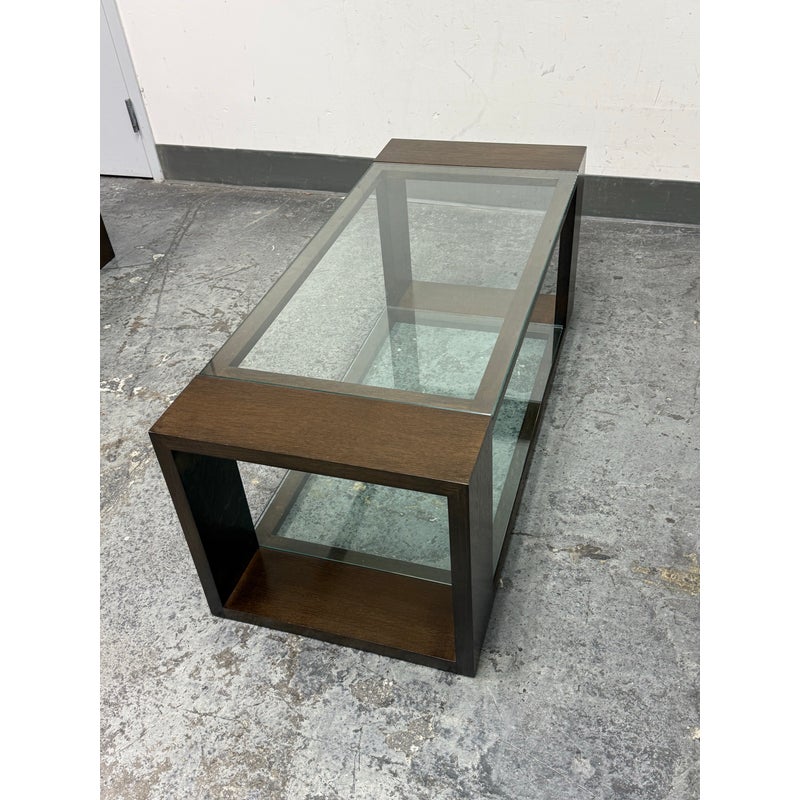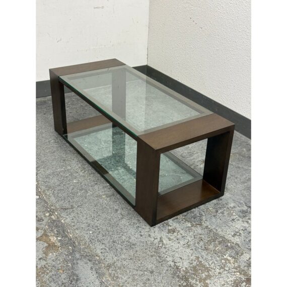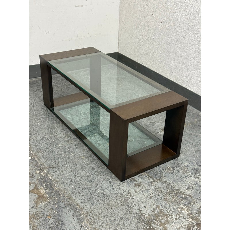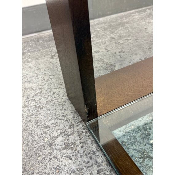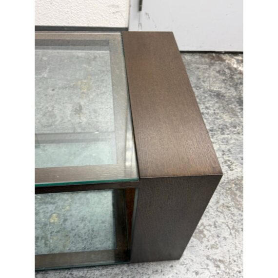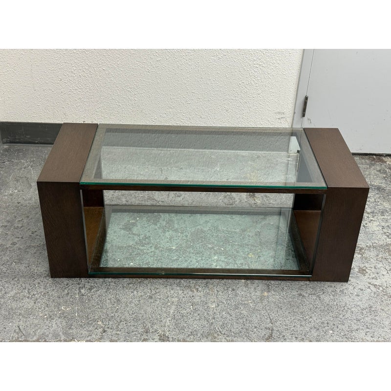 Design Plus Gallery presents a Cerused Finish Wood Coffee Table with Glass Inserts of contemporary and custom design. Sophisticated and nicely designed, the coffee table has an interesting look and feel. There are two pieces of thick, tempered glass that connect both of the wooden frame ends. It has a sculpted and architectural presence. It is in good condition with minimal wear for its usage. Made in California, USA.