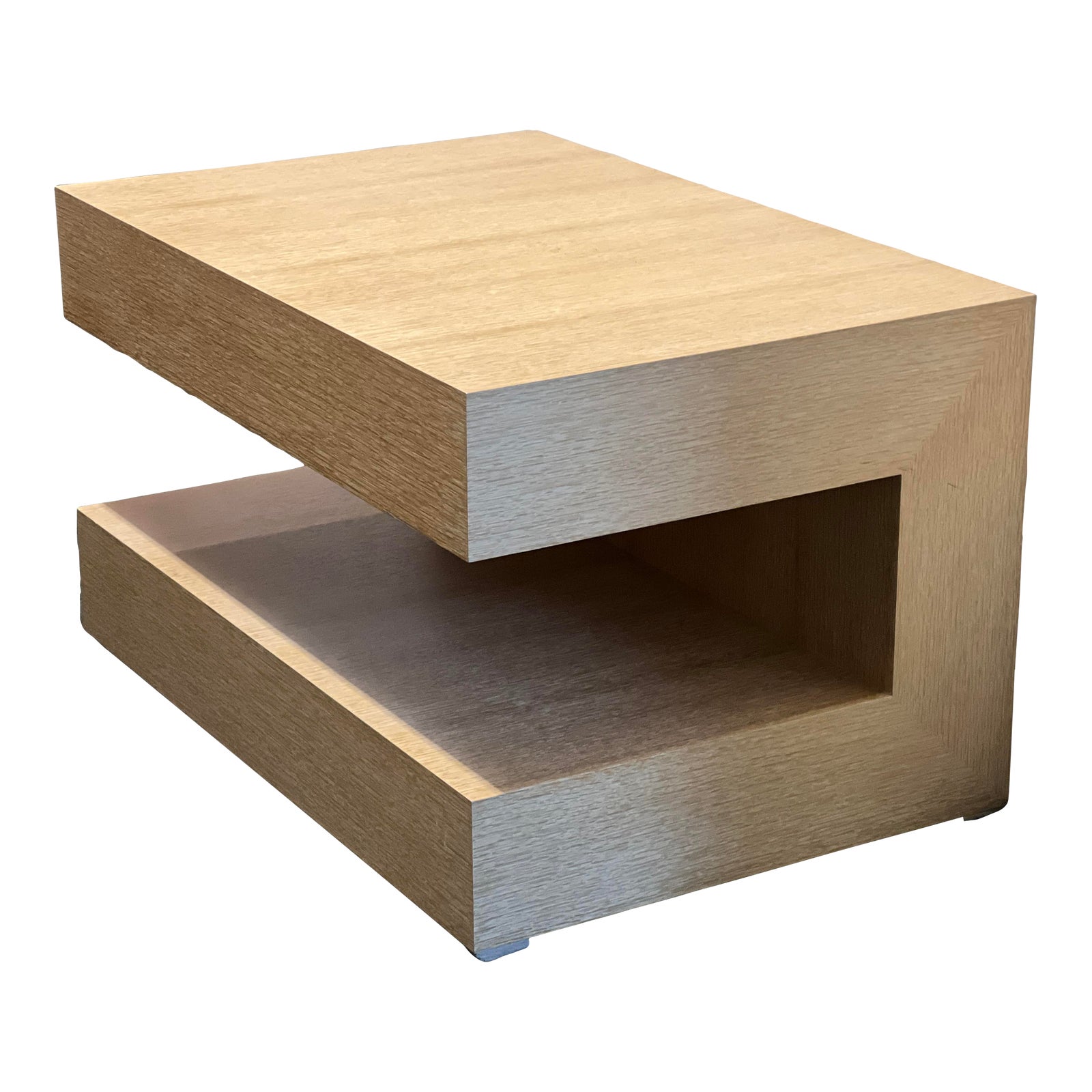 Design Plus Gallery presents a Custom Contemporary Side Table. Wide slab cerused oak wraps this blocky statement side table. An open silhouette, but oh so substantial. Ample display on top surface and storage below and in hidden soft-close drawer. Little evidence of wear; good condition overall.