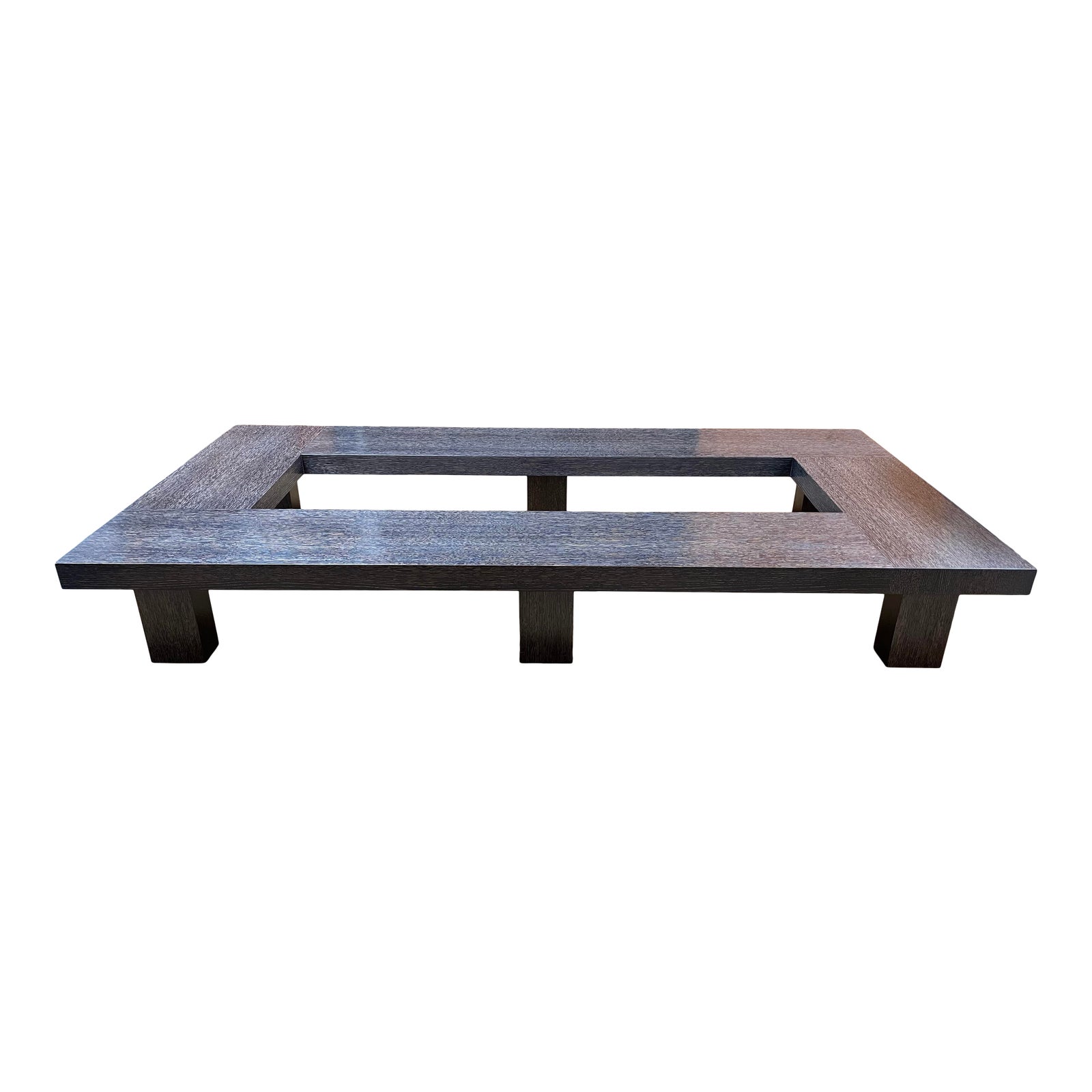 Design Plus Gallery presents an Extra Large Custom Coffee Table. Dramatic dark cerused wood in a modern silhouette creates an amazing focal point in your room. The open center can be filled by your imagination. Sturdy, block legs support the large expanse easily.